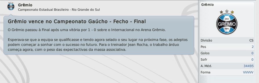 Jirimias Postado 16 de Março 2011 Autor Denunciar Postado 16 de Março 2011 Nada a ver com o seu jogo, mas esse avatar do Jean com roupa vermelha será motivo de corneta da geral do Grêmio. Já percebi que o Jean aproveitou a oportunidade, mas que ele é colorado, ah, isso é. E muito! hsauhsahsau vcs me divertem,sabe?Não tinha pensado nisso. :lol: Mestre Khadaff sabe, observa e comenta tudo. Claramente vejo uma arbitragem tendenciosa: tudo jogo o time adversário tem um expulso. Se Mancini vencer o Campeonato Gaúcho, não só o primeiro turno, eu até paro de cornetar ele... pelo menos até a próxima derrota. Coitado do Mancini, ele tá lascado com vc.Admito que se depender de mim, ele cai na próxima partida. Grêmio,Campeão Gaúcho!!!Final – Campeonato Gaúcho – Segundo Turno: Estou aprendendo que um Grenal nunca é igual ao outro.Este de hoje seria o mais importante, até o próximo.Durante toda a semana a cidade respirou os ares do grande derby.Era muito expectativa, principalmente dos rivais, que no primeiro turno não conseguiram chegar à final. Uma vitória do Inter, adiaria a decisão, uma vitória do Grêmio, o Rio Grande do Sul teria um novo campeão.Cinquenta e dois mil ingressos foram colocados à venda, e já estavam esgotados dois dias antes da partida. Entrávamos como favoritos, mas tentei evitar que os jogadores se deixassem levar pelo oba-oba, que nada tem a ver com um clássico deste tamanho. Nossa torcida lotou a Arena, cantava desde o início a provável derrota do rival.Mesmo com o Grêmio poupando jogadores, a confiança na vitória era grande.Do outro lado, Mancini colocava em campo o melhor que podia, inclusive o artilheiro do campeonato: o atacante Beto, que joga sua quarta temporada pelo Colorado, depois de uma transferência do Bragantino. O jogo sempre esteve sob o controle do Grêmio, mas o gol não saía.No lance mais agudo Gil lançado no meio de dois defensores bateu da entrada da grande área mas Gabriel defendeu.Minutos depois, o próprio Gil foi lançado na direita, entrou na grande área e bateu cruzado, abrindo o placar. Como aconteceu nos outros em que saímos na frente, o Internacional não conseguiu reagir.Continuamos pressionando e o segundo gol parecia cada vez mais próximo. Voltamos ao segundo tempo debaixo dos pedidos de "Mais Um" da torcida, o que serviu para deixar os jogadores colorados mais nervosos.Por outro lado, foi difícil segurar a ansiedade dos meus jogadores, que arriscavam de longe, e nem sempre de forma perigosa. O jogo chegou ao fim: o Grêmio vence os dois turnos do Campeonato Gaúcho.O primeiro título da minha carreira. Citar
