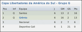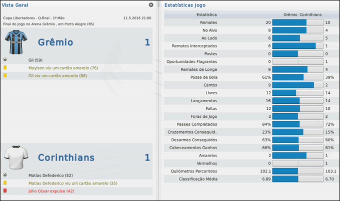 Jirimias Postado 17 de Março 2011 Autor Denunciar Postado 17 de Março 2011 Termina a Libertadores para o Grêmio!Publicado em 19/05/2016 por gfbpa Melhor em campo, o Grêmio não conseguiu marcar gols no jogo de volta contra o Corinthians.A partida terminou 0-0.Com o empate em 1 a 1 no primeiro jogo, o Corinthians conseguiu a classificação pela regra dos gols marcados fora de casa.Corinthians e Flamengo fazem uma das semi-finais, enquanto Cruzeiro e Toluca, do México, fazem o outro confronto da semi-final. [...]Tags: Primeiro jogo ; Segundo jogo ;; Campanha Grêmio na LibertadoresSufoco até o fim, mas Grêmio segue!Publicado em 04/05/2016 por gfbpa Um gol aos 45 minutos do segundo tempo, e o Lanús empatava com o Grêmio no placar agregado.Mas graças aos três gols da vitória por 3-0 na primeira partida, o Imortal segue na competição.Na próxima fase, o Grêmio enfrentará o Corinthians [...]Tags: Primeiro jogo Grêmio termina em segundo na Fase de Grupos! Publicado em 21/04/2016 por gfbpa Com quatro vitórias, uma derrota e um empate,o Imortal Tricolor terminou em segundo no Grupo G para a próxima fase da Libertadores onde enfrentará o Lanus.Antes mesmo da vitória de ontem sobre o Nacional, no Uruguai, o Grêmio já estava garantido, e o resultado somente confirmou a evolução da equipe na competição [...] Tags: Classificação Grupo G Citar