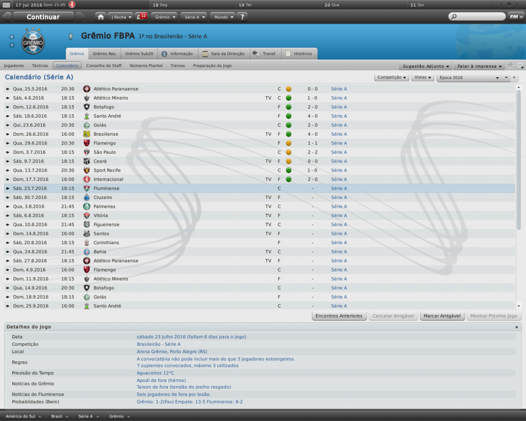 Jirimias Postado 17 de Março 2011 Autor Denunciar Postado 17 de Março 2011 O desgaste com a diretoria. A Libertadores terminou para o Grêmio, mas deixou marcas profundas.Apesar da diretoria declarar-se contente com o trabalho do treinador, nos bastidores o que se falava era em um boicote ao treinador por parte dos dirigentes gremistas, mais precisamente por parte do Departamento Financeiro.Jean Rocha ainda lutava para aumentar o orçamento de transferências, até porque foi uma promessa da diretoria no início da temporada.O pensamento de Jean era reforçar o time já pensando em ter uma equipe ainda mais forte para disputar a Libertadores no ano que vem. Jean sonhava com nomes como Anderson e Douglas Costa, ambos no futebol inglês, e a torcida passou a sonhar também com o retorno das duas estrelas projetadas no clube.Jean se inspirava no modelo adotado pelo Corinthians, que foi capaz de seduzir jogadores como David Luiz, e que recentemente convenceu a revelação chilena,Carlos Villanueva, a trocar a Europa para jogar no Brasil. De fato o Grêmio ficou para trás em relação aos outros clubes brasileiros no que refere em investimento no futebol.Uma proposta de R$13M feita pelo Ceará por Júnior Viçosa , reserva do Grêmio, e recentemente vindo de empréstimo do Werder Bremen, era o motivo para mais uma reunião com diretoria a respeito da verba de transferências. ODONE: - Pode começar,Jean, mas vou logo já avisando, nada mudou desde a nossa última reunião. JEAN: - É uma pena,Sr.Odone.Vejo o Grêmio ultrapassado pelos rivais.Precisamos ter uma equipe mais forte e competitiva para a próxima temporada. ODONE: - É sempre a mesma coisa,Jean!Treinador só muda de roupa, a mentalidade é a mesma.Tínhamos uma equipe competitiva para disputar a Libertadores, e agora esta equipe não serve mais.Lamento que você, com tão pouca rodagem no futebol, já tenha adquirido estes vícios da profissão. JEAN: - Lamentável que o senhor veja assim.Estamos perdendo jogadores por não conseguirmos aumentar os salários na renovação, e o senhor me diz que eu estou sendo exigente, alienado e irresponsável? ODONE: - Não disse isso.Espere, não me deixe falando sozinho!Ei,Jean,volte aqui! Jean terminava mais uma reunião como sempre fazia: deixando o dirigente falando sozinho. Dias depois Jean Rocha estava em uma coletiva de imprensa rodeado por um grande número de repórteres.Também estavam ao seu lado Robinho, ex-Milan, Fábio Ferreira e Vagner, zagueiros vindos da Europa, e Dario Conca,contratado junto ao Fluminense.Por sua vez, a diretoria do Grêmio não escondia sua insatisfação, e não enviou nenhum representante para a coletiva. Sem dinheiro,Jean apostou em jogadores que estavam sem contrato ou que já não interessavam aos seus clubes, mesmo sem gastar dinheiro," El Playstation" conseguiu ganhar a torcida com a contratação de Robinho, ainda que o mesmo já não fosse sombra daquilo que foi no passado. Admirado e odiado Definitivamente,"El Playstation" era a grande atração do futebol brasileiro.Torcedores de outros clubes, até mesmo do rival Internacional, faziam questão de apoiar o treinador em toda a rede.O apoio incondicional ao treinador atravessava os cabos de fibra ótica, e Jean Rocha, muitas vezes era a razão para que alguns torcedores se encorajasse a ir ao estádio em um jogo comum de quarta-feira.Também não era todo dia que se poderia ver um treinador de um clube profissional que jogar FM à beira do gramado. Em campo, os resultados do treinador mereciam destaque, mesmo que muitas vezes suas escolhas fossem questionadas."Falem mal, mas falem de mim", esta era a relação de Jean com seus críticos.A lista de admiradores do trabalho de Jean Rocha crescia com a mesma proporção de desafetos.Muricy Ramalho,Adriano e mais recentemente, Vagner Benazzi, eram os que mais se incomodam com o sucesso do treinador de video-game.Jean não gostava da polêmica, mas não deixou de responder à altura o treinador Vagner Benazzi.Coincidentemente, Benazzi perdeu seu cargo dias depois do comentário de Jean feito como resposta ao até então treinador do Botafogo. Citar