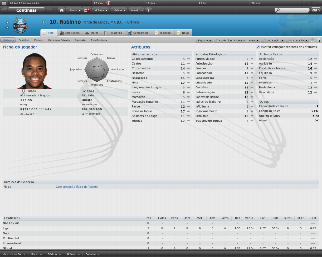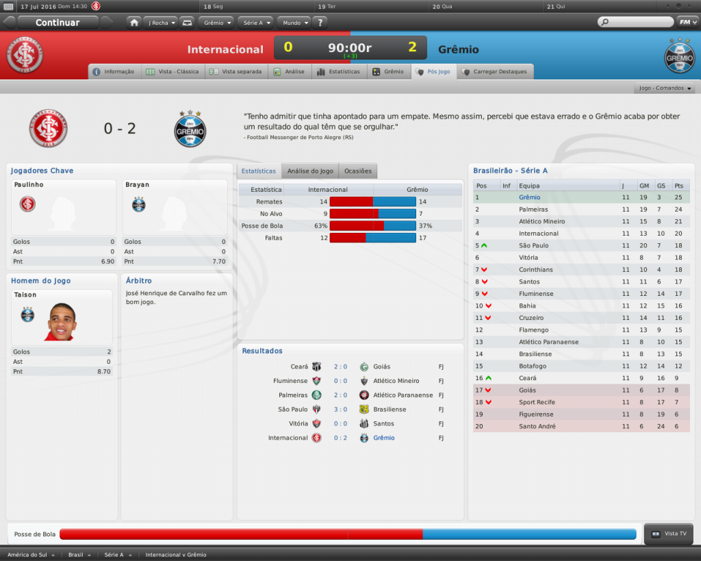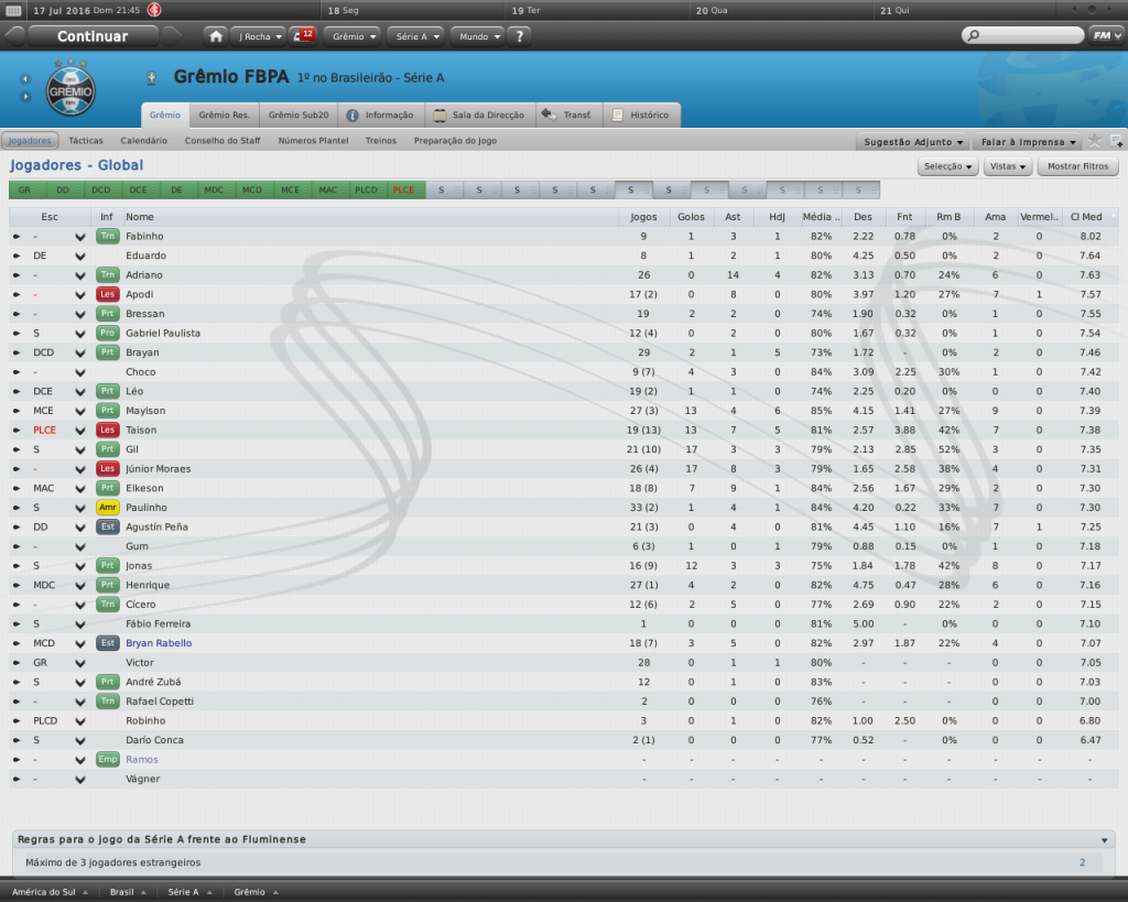 Jirimias Postado 18 de Março 2011 Autor Denunciar Postado 18 de Março 2011 Taison jogando muito, como eu disse anteriormente. Agora resolveu meter dois no clube que o revelou. Se não fosse a diretoria, melando os negócios do time, dava pra montar um timaço. PEna que ele se machucou, pois vinha jogando fácil. Eu já tinha em mente alguns jogadores para formar um timaço, mas a diretoria quebrou a promessa. Ganhou o Gauchão de uma excelente forma, tirando o Inter na final do segundo turno... E na Liberta.. Corinthians ? :blink: Não combina, mas... Robinho é um bom jogador, mas está velho, e o Conca também, por isso não aprovo a contratação dos quatro jogadores.. A idade, e o salário também, que não são nada amigáveis.. Eh, mas o Fm é sem noção, tanto que o Corinthinas é bicampeão da Libertadores e vai rumo ao tri rsrs A contratação destes jogadores foi para compor o elenco, como não tenho dinheiro para contratar, foi uma forma de protestar com a diretoria, gastando toda a verba de salários. Citar