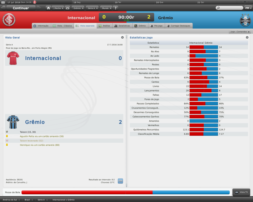 Jirimias Postado 18 de Março 2011 Autor Denunciar Postado 18 de Março 2011 Parabéns pela vitória, Taison jogou muito no Grenal, pelo menos é o que parece. Gostei da contratação do Robinho, é um grande jogador, desde que não faça com no Santos. Melhor mesmo é tu ir pro Santos, pena é que sempre vence. Ele jogou bem mesmo!O Taison está em boa fase, mas foi legal que não tenha se omitido no jogo contra o Inter. Robinho, ainda velho, vai ajudar bastante, mas duvido que jogue como no Santos. O futuro ainda não planejei, mas para continuar + uma temporada no Grêmio só mesmo algo de extraordinário. Boa vitória contra o Inter E vai te ferrar, tirou o Conca do flu... Fiz um favor pro Flu, o Conca já era, nem é a sombra do que foi! rsrs Começou o Brasileirão com o pé direito, para calar a diretoria burra. :P Mais um Gre-nal vencido, é isso aí. Taison seguindo a filosofia do Dan! Na verdade a diretoria adora quando os resultados aparecem, eles acreditam que o clube tá muito bem, e não precisa de investimentos. hehe bem lembrado, o Taison deve estar conversando muito com o Dan Não gostei destes últimos reforços. São jogadores velhos, em decadência física e se tiver classificado para a Libertadores, duvido muito que eles consigam aguentar o ritmo de jogo. Você está certo quando fala de uma nova temporada, tb não acredito que estes jogadores terão papéis decisivos, mas o pensamento foi para esta temporada mesmo. Você não conhece Grenal. Essa direção e esse técnico não representam este manto. O Inter mesmo está la no save "A Procura do Sucesso", muito melhor que essa cópia do Renato Gaúcho treinando este time marrento que só comemora vaga. Muita marra pra quem só ganhou um Gaúchão onde faltou futebol. Taison brilhando no Gremio? Jogo mentiroso <_< Edit: Esse time do Inter não tem personalidade, até quando joga melhor falta disposição e competencia. 63% de posse de bola, 14 remates, 9 no alvo, 3 flagrantes e... NADA! Nem cartão esse time tomou... Tirando o que tá ruim, o resto do save tá ótimo :thumbsup: hsuahushau Taison brilha muito no Grêmio! O domínio do Inter é virtual, só aconteceu pq eu recuei a equipe, já que o resultado estava feito.Conforme a reunião de aconselhamento, o Inter faz a maioria dos seus gols nos 15 minutos iniciais, não fizeram, não iam fazer depois heheh. Agora, o mancini deve ter um amigo muito poderoso lá dentro, nem o Muricy teve a piedade do Fla, e olha que o trabalho dele por lá foi bom. Vágner Benazzi é um fanfarrão. Levou na cara para deixar de ser marrento. Vou te dar uma dica Jean. Larga os Bananas de Pijamas e vai para os lados do Menino Deus. Lá tem um clube rico e com recursos suficientes para levar seu nome ao topo da América! o Benazzi é um mané mesmo, agora vai comentar jogo na Rede TV hehe. Obrigado pela dica! rsrs Sem falar que é especialista em Libertadores. Tem alguns paulistas por aí que já jogam a toalha ao saber que estamos no caminho deles... Olha a polêmica,Dom! :lol: Citar