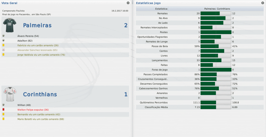 Jirimias Postado 22 de Março 2011 Autor Denunciar Postado 22 de Março 2011 Fim da invencibilidade! A diretoria do Corinthians apostava em 2017 em uma mistura interessante: um treinador popular em uma equipe popular.O anúncio de Jean Rocha como treinador do clube dividiu os torcedores do Timão, aqueles que eram contra, temiam pela sina de fracasso que acompanhava o treinador.Cabia então ao técnico ganhar a confiança desta outra metade, e isso apenas resultados e títulos dariam jeito.Um bom começo: Oito vitórias em oito jogos! O começo do treinador foi promissor: em oito jogos do Campeonato Paulista, o Corinthians venceu as oito partidas e não sofreu um gol sequer.Apesar do retrospecto, havia quem duvidasse que a sequência positiva se mantivesse contra os grandes clubes.A dúvida permanecia até a 9º rodada, quando Palmeiras e Corinthians se encontrariam...Fevereiro de 2017 9º rodada Campeonato PaulistaClique para ver as estatísticas! Devido à capacidade da Arena Palestra Itália, o clássico foi transferido para o Pacaembú, bom para os corinthians que se sentiram mais em casa que os palmeirenses, apesar do mando do jogo ser do Palmeiras. A partida começou equilibrada com as duas equipes revezando-se no ataque.Do lado do Palmeiras, Valdívia infernizava os defensores, enquanto do lado alvinegro, era Dentinho quem comandava as jogadas mais perigosas.Aos 36 minutos, o zagueiro Welton entrou forte em Sanchez e foi expulso, a partir daí a partida foi dominada completamente pelo Palmeiras. Mesmo melhor e em vantagem numérica, o Palmeiras sofreu o primeiro gol: logo no início do segundo tempo, o meia Willian chutou de fora da área, acertando o ângulo, indefensável para o goleiro Bruno.O Palmeiras não sentiu o gol, e a reação veio seis minutos depois com o lateral Álvaro Pereira.O gol de desempate era só uma questão de tempo, e assim foi.Faltando oito minutos para o fim do tempo normal, Adailton subiu mais alto que a defesa do Corinthians e virou o jogo. Com a vitória, o Palmeiras, que perdeu para o Santos na estréia, acabou com a invencibilidade do Corinthians, e assumiu a liderança.Destaques da 9ºrodada Pessoal, Como ainda tenho dores da cirurgia, fica difícil concentrar para fazer os textos de ficção, por isso vou mantendo por enquanto o save atualizado apenas com textos dos jogos, como venho fazendo.Assim que eu tiver ok, eu retorno com os diálogos do Dan. Citar