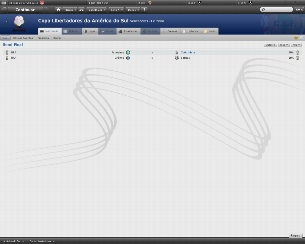 Jirimias Postado 24 de Março 2011 Autor Denunciar Postado 24 de Março 2011 vai perde a final pro meu Palmeiras :bleh: Ah, mais um pra me secar :heh: Vamos ver :specool: Colocou aquele título de fim de um tabu por causa das minhas críticas por aqui foi? :bleh: Time vem voando na Libertadores, quero só ver no mata-mata, onde o time sempre fraqueja. Já está na final, teve sorte de não pegar o Santos, deve vencer sem dificuldades. Agora isso é um erro do FM, por que na vida real a única vantagem do primeiro colocado é poder jogar em casa as partidas, se empatar teria que ir para os pênaltis. Èh, tem alguma influência sim :lol: Por enquanto a Liberta tá tranquilo, sei que não vai ser sempre assim.No Paulista, o Santo ficou de fora, como já os venci antes, não seria difícil repetir :heh: A regra do FM tá erada, mas fazer o quê?Comemorar hehe Citar
