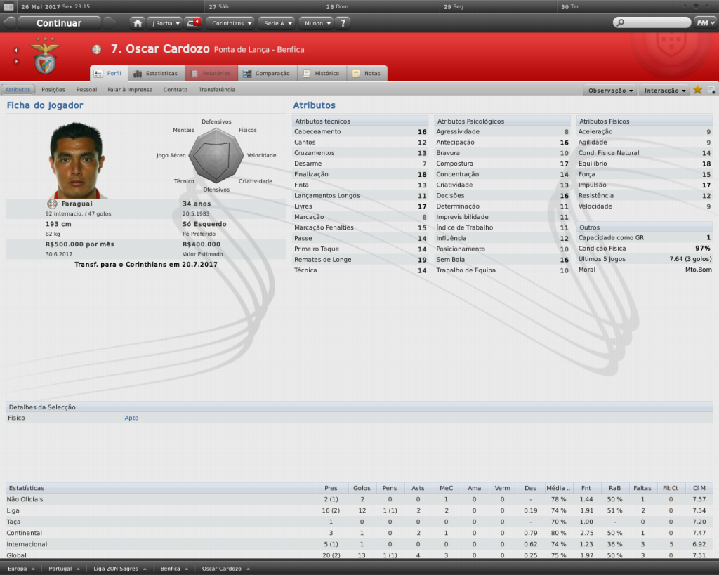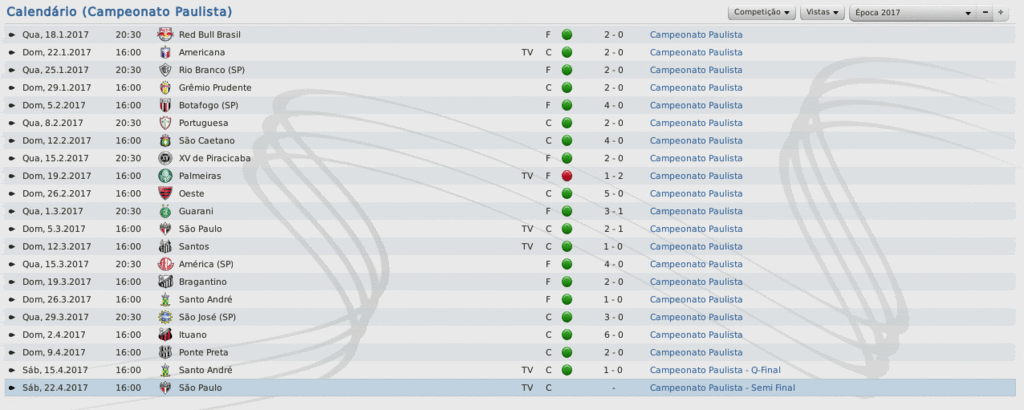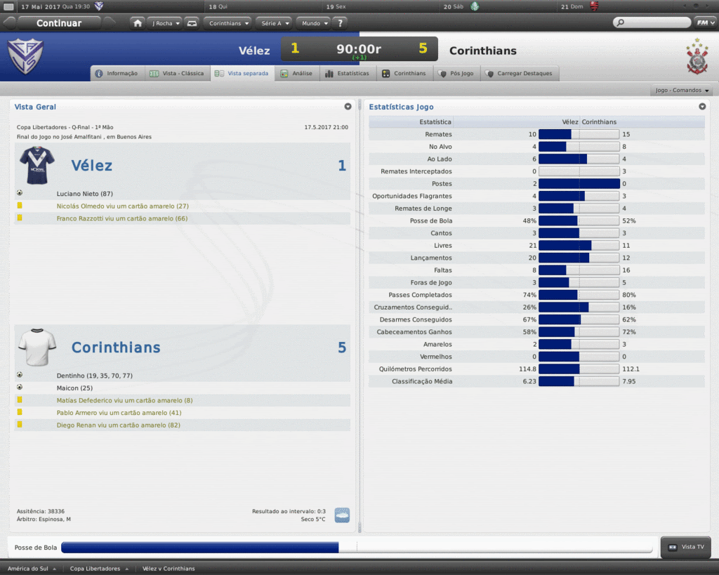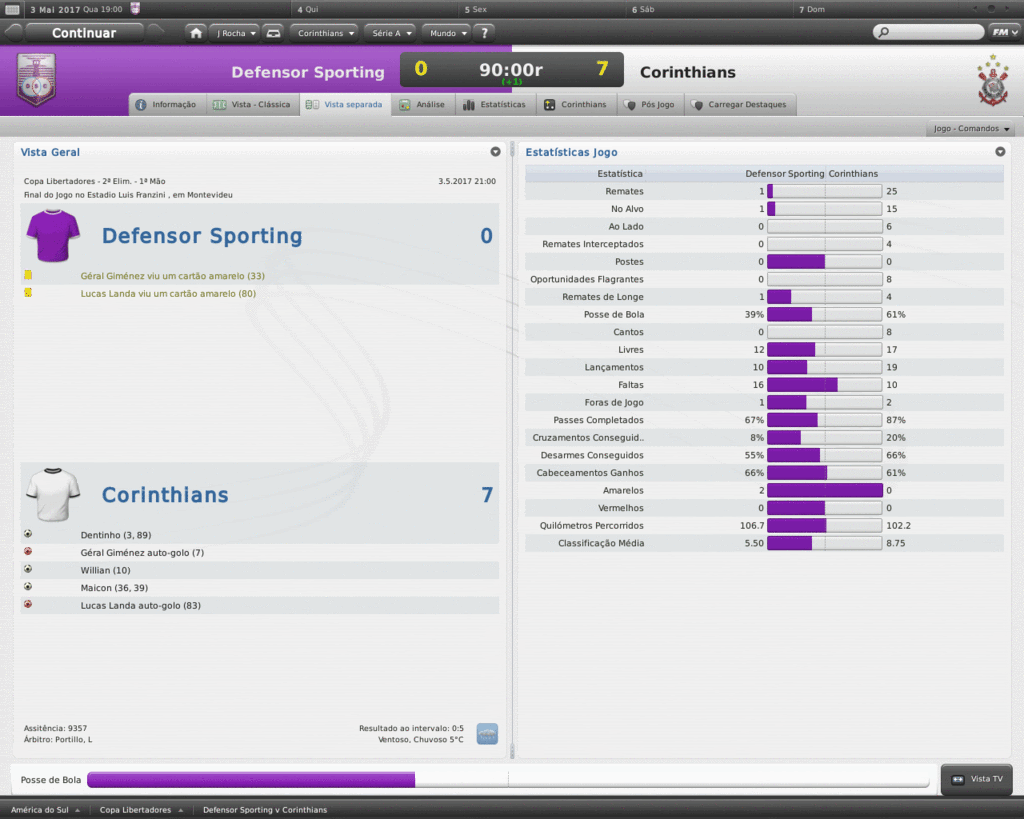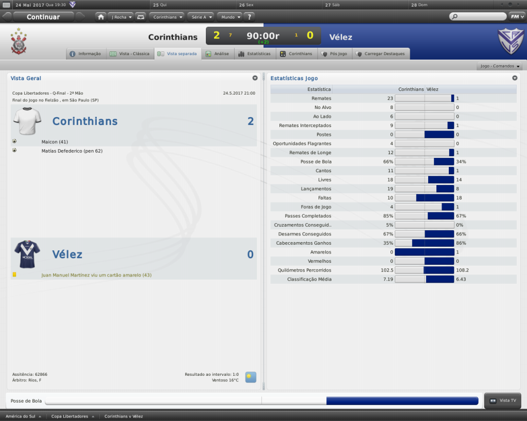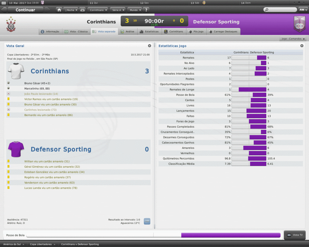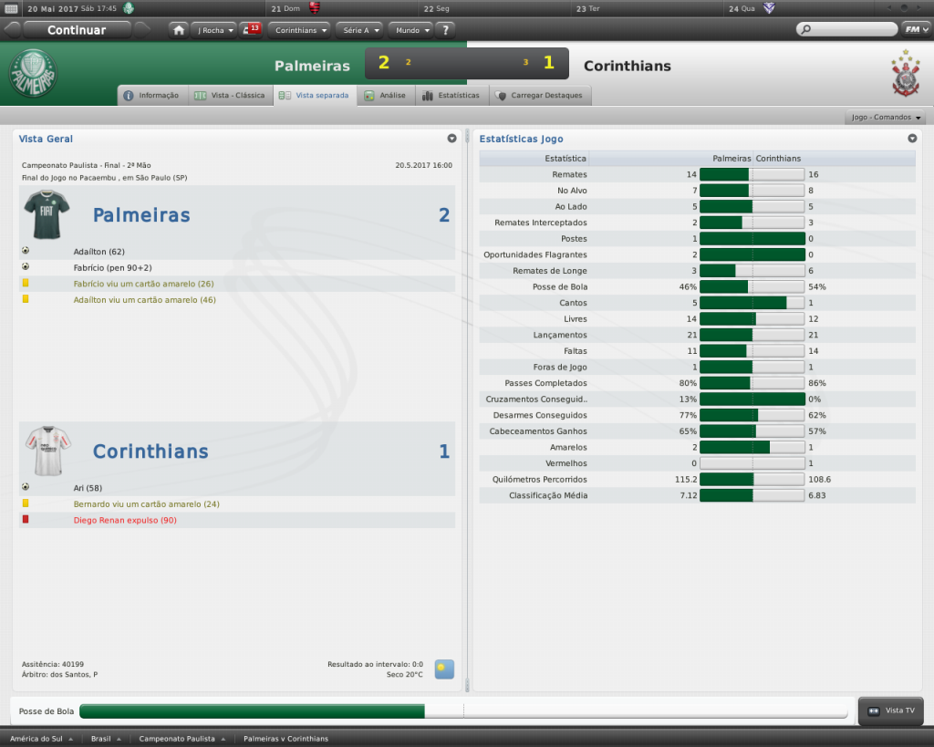 Jirimias Postado 24 de Março 2011 Autor Denunciar Postado 24 de Março 2011 Na final, mesmo sem vencer! Semi-Final, Paulistão Mais uma vez o São Paulo cruzava o nosso caminho, desta vez a partida valeria a participação na final.No outro jogo, o Palmeiras já havia garantido presença ao vencer o Santos por 1-0. Voltando ao jogo, lancei novamente uma espécie de 4-2-4, bem semelhante ao que eu utilizei em um save da minha época de FMANAGER.Naquela oportunidade, a tática conhecida como Magia Magyar tentava repetir o feito de um Honvéd.Lá eu não tinha jogadores como eu tenho aqui, e tive resultados bem interessantes. Este não era o primeiro jogo do 4-2-4, há alguns jogos já venho utilizando, deixando de lado o LOSANGO.Uma coisa a nova tática já tinha de melhor que a outra: o melhor uso da força ofensivo, com menos chutes de longa distância, com maior aproximação do gol adversário, que resulta em mais jogadas perigosas. Esquema na mão, fomos pra cima.dava tudo certo, até que Defederico perdeu uma bola na esquerda do nosso ataque, e deu uma entrada gratuita e violenta no lateral tricolor.O árbitro expulsou o argentino, e a partir daí o jogo ficou muito difícil. O campo ficou grande para 10, logo os jogadores iam se desgastando mais que os adversários.Para ajudar, a arbitragem na pessoa do Sr. ROGÉRIO PEREIRA COSTA (aquele de sempre) só enxergava falta do Corinthians, e Zé Vitor (SP), conhecido por ser um jogador rude e sem técnica, curtia seus momentos de ladrão de bola em cima da incompetência do árbitro. Mas de nada adiantou a superioridade numérica e a visão seletiva do árbitro, pois o São Paulo está a uma distância enorme do Corinthians com 10 jogadores de olhos vendados.A partida não teve gol, mas graças à nossa campanha na Primeira Fase, seguimos em frente. Sem Defederico suspenso, ainda quebro a cabeça para montar o time para enfrentar o Palmeiras.Também não terei Jô, que ficará uns três meses de molho, depois de uma lesão na Libertadores. Só para citar, tive um pequeno atrito com Defederico depois que multei ele em uma semana de salários em virtude da expulsão.Ele achou ruim, mas no final, mostrei para ele quem manda. Citar