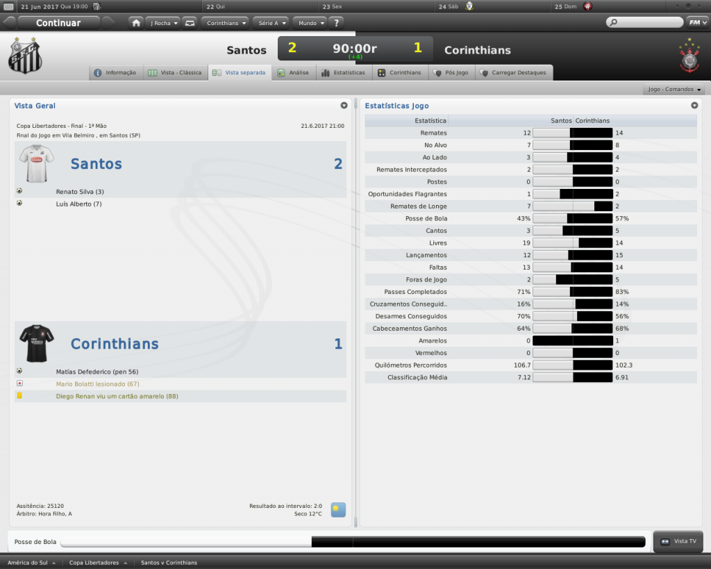 Jirimias Postado 24 de Março 2011 Autor Denunciar Postado 24 de Março 2011 Repeteco!Libertadores, semi-final, Primeira mão O terceiro confronto confronto contra o Palmeiras tinha um peso diferente, até porque valeria vaga na final da Libertadores.Na semana do primeiro jogo, o treinador do palmeiras, Jádson, fez o que é de seu costume: declarou que me odeia e tudo mais.Diferente das outras vezes, não o ignorei, e desabafei em um programa de rádio. Já poderia imaginar que toda esta tensão extracampo iria chegar ao campo de jogo.Além do nervosismo instalado no ambiente, ainda teria que contar com vários desfalques importantes: David Luiz,Diego Renan, Maicon e Dentinho, na Seleção Brasileira, Pablo Armero,Villanueva em suas seleções e Fagner Jô e Carlinhos no departamento médico.Eu teria que ter criatividade para montar uma equipe, mas uma coisa era certa: não teria nenhum lateral esquerdo de ofício.O Palmeiras também teve problemas com convocações, mas era apenas duas: Valdívia e Sanchez Tragédia feita, fomos para o jogo, que mais uma vez aconteceria no Pacaembú.Mesmo desfalcado, o Corinthians era melhor no início do jogo. Na primeira oportunidade mais clara de gol, Willian chutou em cima de Bruno.Enquanto isso o Palmeiras arriscava de longa distância, mas sem muito perigo. O jogo era equilibrado, só voltamos a ter chances de marcar aos 26 minutos, Vitor Ramos, improvisado na lateral esquerda, tabelou com Ari e da entrada da área chutou forte e alto: bola fora. Corinthians de novo no ataque, Bernardo carregou a bola, abriu espaço na defesa, e na meia lua da grande área arriscou pro cima do travessão.Não demorou um minuto para desperdiçarmos outra oportunidade de gol, Ari fintou o zagueiro, correu, entrou na área e chutou forte, mas Bruno espalmou para o lado. Pressionamos novamente, desta vez Júlio trocou bola com Ari e chutou no cantinho, mas a bola caprichosamente foi para fora.Minutos depois, Bernardo novamente com velocidade arrancou do meio-campo, chegou na ponta da área e chutou com efeito, a bola tirou tinta do travessão. O primeiro tempo terminou sem gols, e com domínio predominante do Timão. Começou o segundo tempo, e o Corinthians manteve o ritmo.Logo no primeiro minuto, depois de triangulação com Willian,Luís Felipe, Júlio César chutou forte e com efeito para abrir o placar. O gol mexeu com o Palmeiras que veio para frente.Adailton chutou,Júlio defendeu bonito espalmando para o lado, a bola sobrou para Tinga que chutou para a defesa em definitivo do nosso goleiro.Minutos depois o Palmeiras chegou perto novamente,Adailton chutou forte na tave, a bola subiu Patrick chutou novamente, e Júlio César pegou firme. Respiramos aos 15 minutos, Bolatti lançou Defederico, que em velocidade entrou na área e chutou, grande defesa de Bruno!A resposta do Palmeiras foi bem parecido, Patrick lançou Adailton na direita, que entrou na área e chutou para Júlio César jogar para o escanteio. Passamos a explorar o contra-ataque, Bernardo lançado se aproxima da área, quando Fabrício derrubou por trás.O árbitro deu vermelho para o capitão.Aos 33 minutos, uma obra prima.Bolatti desarmou, Willian recebeu e lançou Ari que passou por Digão, deixou Everton Sena no Chão, e no canto para vencer Bruno: lindo gol! O Palmeiras ainda teve mais uma chance, mas o placar não mudou.Repetimos o placar do primeiro jogo do Paulistão, e mais uma vez contamos com uma vantagem na semi-final.] Citar