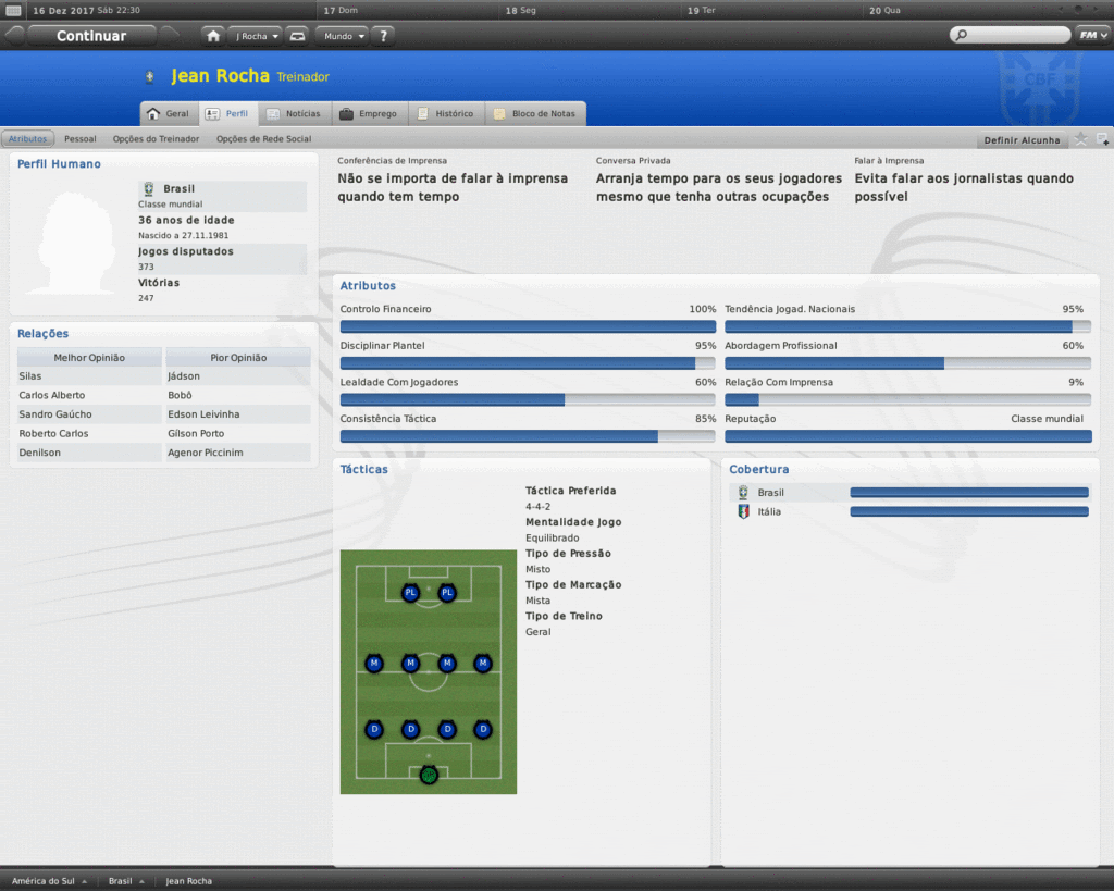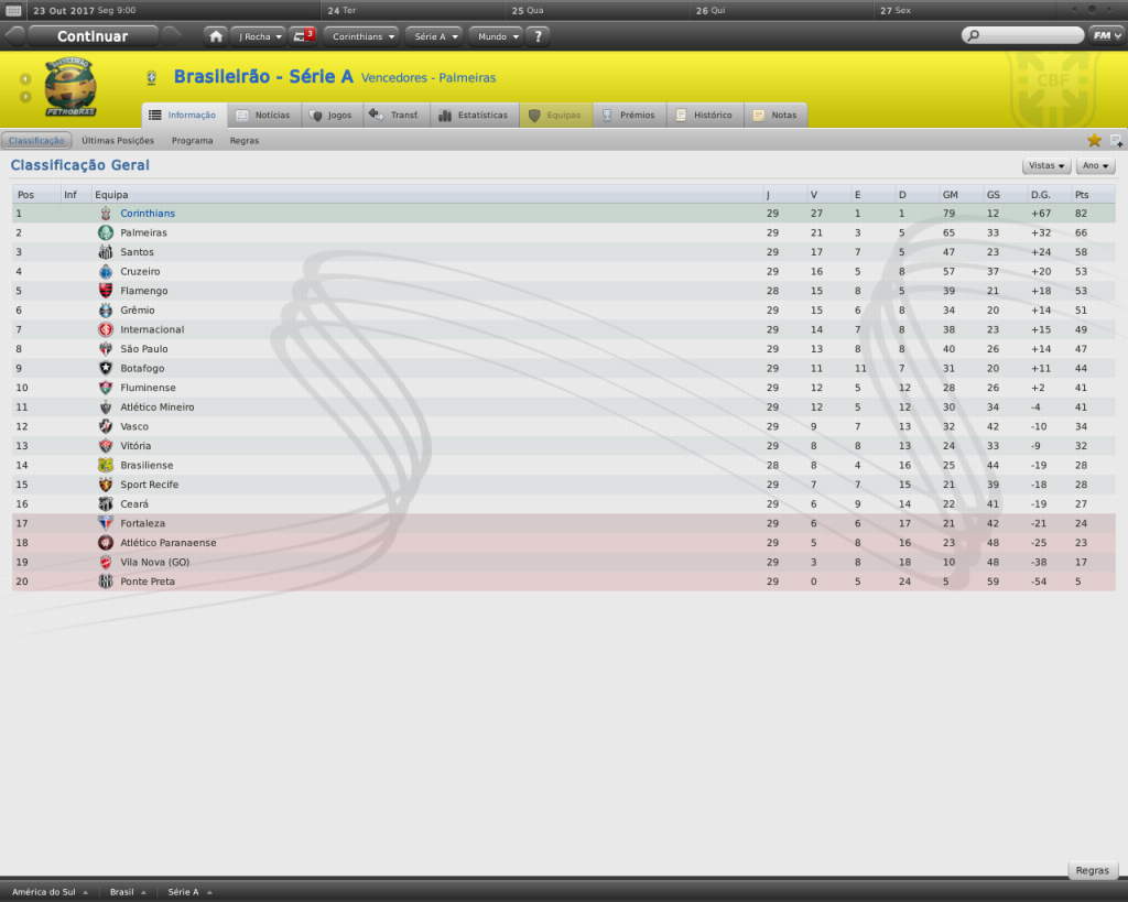 Jirimias Postado 26 de Março 2011 Autor Denunciar Postado 26 de Março 2011 Corinthians, Campeão Brasileiro de 2017 Fim de campeonato Agora como manager de FM, e não como o treinador.... Foi fácil demais!Depois da vitória sobre o Botafogo, e com a vantagem de 18 pontos alcançada, eu resolvi tirar férias no jogo.Tava ficando bem chato, e eu não tinha muita paciência de esperar o fim do campeonato.Nas mãos do meu adjunto Carille, o Corinthians foi bem, exceto por um empate e uma derrota vexaminosa perante o Flamengo. Mas nada disso ofuscou o brilho da melhor equipe já formada no Brasil em todos os tempos.Este título por minha conta.Chegamos aos mágicos 100 pontos, queria também chegar aos 100 gols, mas fora do jogo só poderia torcer.Um motivo de orgulho, mas também foi um problema para escalar a equipe em alguns jogos, foi o fato do Corinthians ter se tornado a base da Seleção Brasileira com nada menos que 7 jogadores: Ari,que substituiu o colega de clube Maicon quando este contundiu,Willian,Dentinho,Wellington Silva,Dedé,David Luiz e o goleiro Júlio César.Aguardando o Mundial... Agora a cabeça está no Mundial.O primeiro desafio será o Chivas, na outra semi-final, o Sydney F.C. enfrenta a Internazionale.Tivemos algumas baixas por lesão que resultaram no corte de alguns jogadores, como é o caso de Bernardo e Cardozo, Lautaro Costa foi listado, mas será dúvida se passarmos para a final.Júlio, nosso médio espetacular, não joga contra os Mexicanos, mas estará apto em uma provável final contra os italianos. Sobre a carreira, a única certeza é que não continuo no Corinthians, eu preciso de um desafio e de novos ares.Só que tem um porém, ainda não tenho nem idéia de qual será o destino.Vamos ver se nas próximas postagens eu tenha novidades para contar.A demissão do Corinthians será depois do Mundial. Citar
