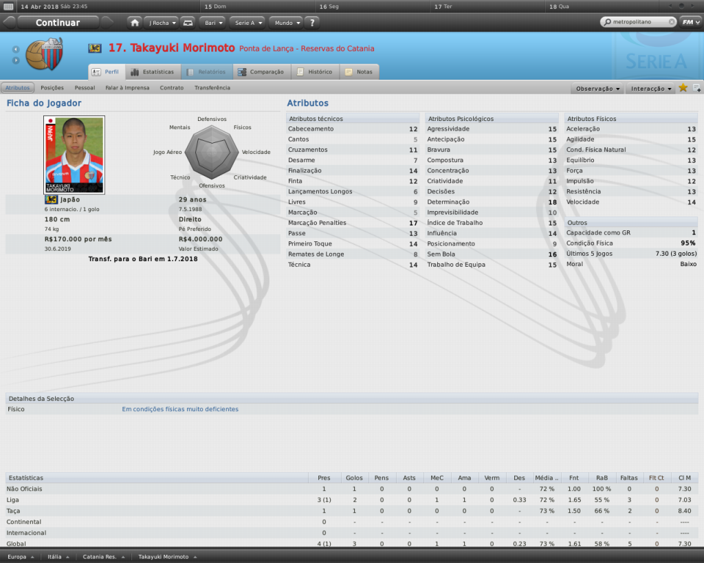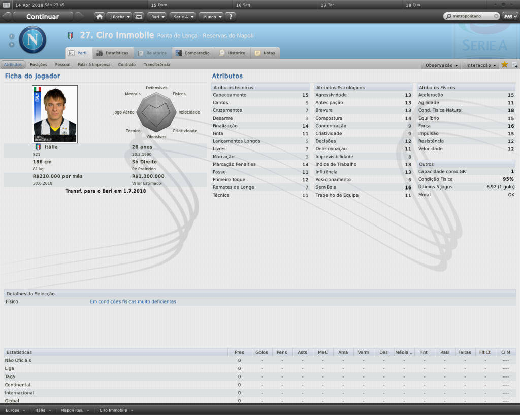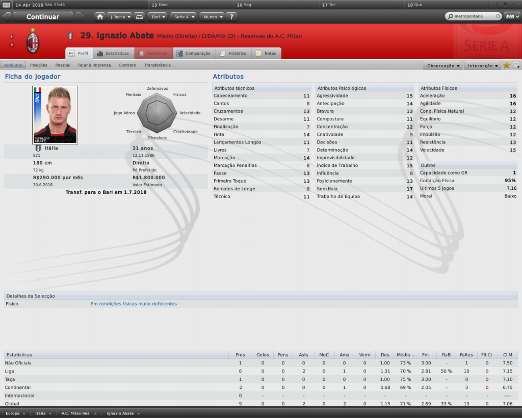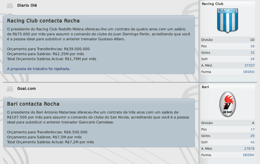 Jirimias Postado 26 de Março 2011 Autor Denunciar Postado 26 de Março 2011 Março de 2018 A conversa de Dan por telefone com o dirigente foi traduzido para o italiano com a ajuda de um tradutor online - Tutto bene,Sr.Matarrese!O quê?Não entende meu italiano?É porque falo um italiano de Gênova um pouco aportuguesado, mas enfim, o que importa é que entramos em acordo.Viajaremos hoje ainda para a Itália.Esteja certo de que o senhor contratou o melhor trenador do Brasil, das Américas e em breve do Mundo.Tchau! - E aí,Dan? - Faça as malas,Jean!Está tudo acertado.Você agora é treinador do Bari. - Bari?Não era a Lázio? - Eu me enganei.Acho que é porque a ligação estava muito ruim, e acho que entendi errado quando o Ney falou que precisavam de um treinador na Itália.Mas é ótimo, não é? - É?Qual a posição do Bari? - Se virarmos a tabela de baixo para cima, o Bari é a quata melhor equipe do campeonato.Mas isso porque ainda não tiveram um treinador como Jean Rocha. - Bom, é melhor do que ficar desempregado. - Ânimo, rapaz!Enquanto tem muito treinador se vendendo por petrodólares, você está indo para a Europa.O Céu é o limite!! Jean não tinha a idéia do que esperava por ele na Itália.Um 11º lugar foi o melhor que o Bari conseguiu nas últimas sete temporadas, e por três temporadas terminou sempre brigando até a última rodada para não ser rebaixado.Chegando a Itália, Jean terá que trabalhar muito para garantir que o Bari não caia, e sua carreira na Europa termine precocemente. No Bari, Jean irá rever velhos conhecidos: Mario Bolatti,com quem trabalhou no Corinthians e Wagner com quem trabalho no Grêmio.Também encontrará os brasileiros Aziz (próximo Lúcio), Tiago e o lateral Diogo, ex-São Paulo. Anexo: Propostas recebidas em três meses. Citar
