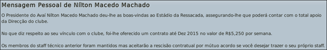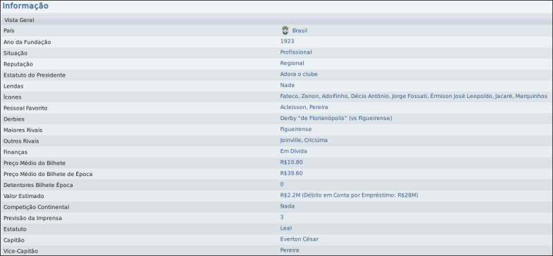 Tsuru Postado 19 de Agosto 2011 Denunciar Postado 19 de Agosto 2011 Boa Sorte ao som de baião, forró e xaxado!! :D :D Obrigado Leandro, mas acho que o ritmo do Raimundo vai mudar um pouco :lol: Começo a acompanhar a partir de agora e desejo muito boa sorte! Bem-vindo, Henrique, e obrigado! A mudança é azul 01/10/2014 Como alguns de vocês souberam pela imprensa, meu ciclo no Salgueiro acabou. Entre desentendimentos com a direção - que se recusava a investir no clube mesmo com as vendas de jogadores e o equilíbrio do caixa -, problemas táticos e falta de confiança, ficou difícil continuar. As derrotas para o lanterna Luverdense, o Atlético-GO e o Coritiba deixaram o time em 18º lugar, na zona de rebaixamento, com minha situação beirando o insustentável e eu pensando no que fazer. Durante a viagem a Curitiba, só se falava que o Avaí, atual campeão catarinense, vive a mais grave crise de sua história - e não sem razão. Após cair da Série B para a C no ano passado, o Leão de Florianópolis fez uma péssima terceira divisão e foi rebaixado para a Série D, com apenas uma vitória em oito jogos. A situação era tão grave que jogadores e diretores foram ameaçados, a sede do clube foi apedrejada, e o caos se instalou pelas ruas de Florianópolis. E, enquanto eu pensava no que fazer, qual não foi minha surpresa quando recebi uma ligação vinda justamente do Avaí? A sondagem virou um encontro, no qual ouvi a oferta e pedi um tempo para pensar. A proposta era ótima, eu iria para um grande clube do Brasil, mesmo em situação difícil, e poderia usar minha experiência nas divisões inferiores para ajudar a equipe - além de trabalhar a longo prazo pela reconstrução e crescimento do Avaí. Por outro lado, dizer "sim" seria descer dois degraus, saindo da Série B e voltando à D. A oportunidade, porém, pesou mais do que a divisão. Assim, fiz as malas, me despedi da minha terra querida e peguei um avião rumo a Florianópolis. A decisão estava mais do que tomada. Informações Gerais | Histórico | Finanças | Staff Durante o almoço em que assinamos o contrato, conversei bastante com o presidente Nilton Macedo Machado, que me deu as boas vindas, e traçamos um pequeno planejamento para a próxima temporada. Minha ideia original era aproveitar o período sem jogos, de outubro a dezembro, para fazermos algumas excursões no exterior e ajudar os combalidos cofres do clube. Mas, durante a conversa, chegamos à conclusão de que não valeria a pena, porque a grande maioria dos jogadores não vai continuar na Ressacada no ano que vem, e terei de aproveitar o período para reconstruir a equipe quase do zero. Em seguida, fui conhecer o CT do clube, o Estádio da Ressacada e fiquei impressionado com o que vi. O clube tem uma estrutura excelente, e, com o planejamento certo, posso garantir que temos tudo para retornar à Série A em quatro anos. Até lá, esperamos melhorar ainda mais a estrutura, investir pesado nas categorias de base, conquistar o Campeonato Catarinense e fazer boas participações na Copa do Brasil. Um grande abraço a todos e até breve, com mais novidades sobre o Avaí! Raimundo Cavalcanti