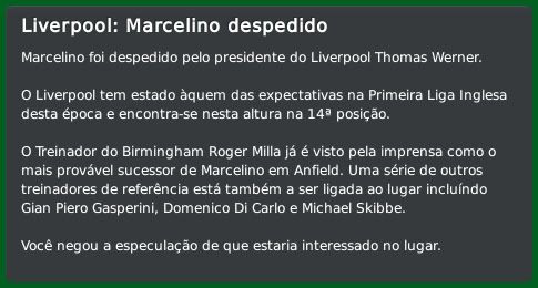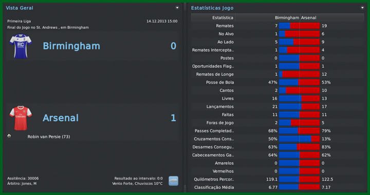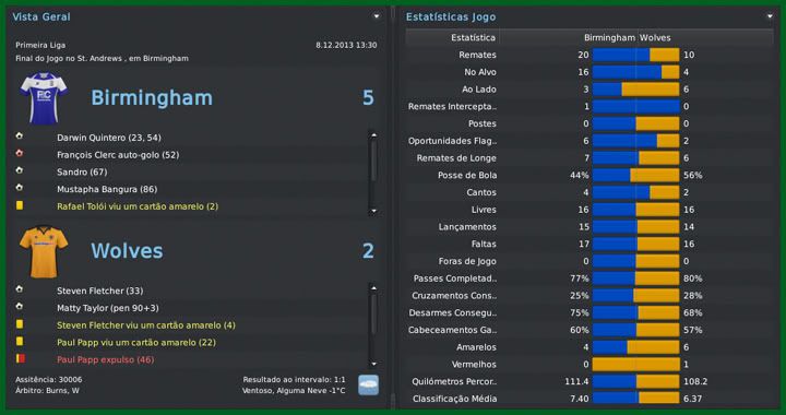 Bruno Trink Postado 15 de Abril 2011 Autor Denunciar Postado 15 de Abril 2011 O Birmingham chega ao fim de 2013 num momento de instabilidade. Muito por causa das contusões do Vela e do Chramosta. Com uma sequência de oito jogos apenas no mês de dezembro, ficamos apenas com Quintero, Lagos e Bangura para o ataque. Contra os "pequenos", tudo bem, mas quando enfrentamos United, Arsenal e Liverpool, não foi suficiente. Vencemos cinco partidas, empatamos outras quatro e tivemos mais três derrotas. Algumas mais sentidas, como contra o Liverpool no último minuto. Os dois atacantes voltam agora em janeiro e espero que sejam suficientes para a maratona que continua nesse mês. Blackburn | Aston Villa | Manchester United | Fulham | Olympique Marseille | Wolverhampton Liverpool | Arsenal | Dinamo Moscou | Liverpool | Blackpool | Sunderland Com a classificação já assegurada, deixei a Europa League de lado e me preocupei apenas com o campeonato inglês. Os reservas não ofereceram a menor resistência ao Olympique Marseille, mesmo no St. Andrews. Esperava também ser derrotado pelo Dinamo e fiquei até surpreso com o empate em Moscou. Terminamos a fase de grupos na segunda posição e temos outro russo pela frente no mata-mata, agora o Lokomotiv. Perdemos duas vezes e empatamos em casa com o United mas as cinco vitórias nos mantiveram ainda dentro do bolo que está disputando o título. Com uma partida adiada para fevereiro, justamente um confronto direto com o Chelsea, chegamos na metade do campeonato na 4ª colocação, quatro pontos atrás do líder Arsenal. Pouca novidade nas cinco primeiras colocações, talvez apenas a ordem. Os gunners estão pintando fortes como maiores candidatos ao título, mas nunca dá para desprezar o poder de reação do City do Mourinho. O Villa deu uma de balão japonês e já está caindo. Lá embaixo, o Liverpool deu uma respirada e se distanciou da zona do rebaixamento. No meio da maratona, optei por deixar a Carling Cup de lado e escalei reservas contra o Liverpool. Os Reds também jogaram com um time misto e foram melhores mas, por duas vezes, no tempo normal e na prorrogação, nós conseguimos empatar na última hora. Estava escrito que não perderíamos aquele jogo por nada e, na disputa por pênaltis, vencemos por 3 a 2. O Arsenal será nosso adversário na semifinal quando, muito provavelmente, também escalarei um time B. Carlos Vela mal saiu do departamento médico e já voltou para lá, com um estiramento no joelho. Justamente quando perdemos, com a mesma lesão, o Chramosta, seu substituto e, até então, artilheiro do time na temporada. Nenhum elenco se sustenta com duas perdas assim, na mesma posição. Quintero teve que se superar, marcou seis gols e passou o tcheco na artilharia. O Lagos até que não ficou muito atrás e até o Bangura marcou seus golzinhos. Mas, claro, sentimos falta do Vela e do Chramosta. Janela de inverno chegando e o mais assediado é Rafael Tolói, principalmente pelo Sevilla, mas, enquanto eu puder, pretendo manter o zagueiro no Birmingham. Por outro lado, estou cogitando a hipótese de trazer um ou outro reforço, mas em qualidade, não em quantidade, já que estou satisfeito com a profundidade do elenco. Quem deve estar dando adeus ao clube é Frank Lampard. O veterano começou cinco partidas e entrou outras tantas no segundo tempo mas não marcou nenhum gol nem fez nenhuma assitência. Seu contrato vai até o fim da temporada e tem uma cláusula de renovação automática por mais um ano se ele fizer 20 partidas. Como eu não sei se contam apenas partidas pela Premier League, devo deixá-lo encostado até o fim da temporada. Osasuna e Valencia despediram seus treinadores na mesma rodada da Liga BBVA e Milla foi especulado para se mudar para a Espanha. Na Inglaterra, depois de várias "guerrinhas" através da imprensa, Marcelino foi mandado embora pelo presidente do Liverpool. Pelo jeito, o vitorioso dessas batalhas verbais foi o camaronês... Citar