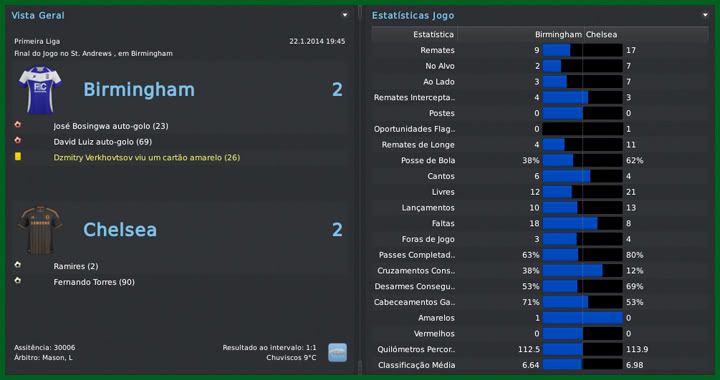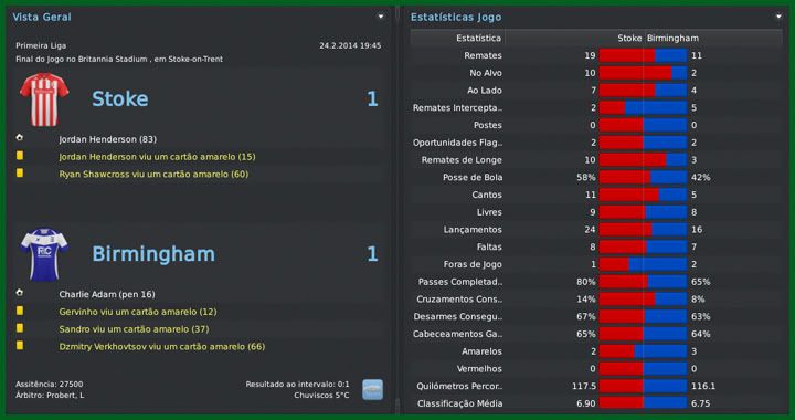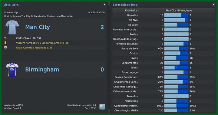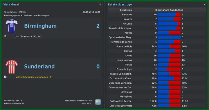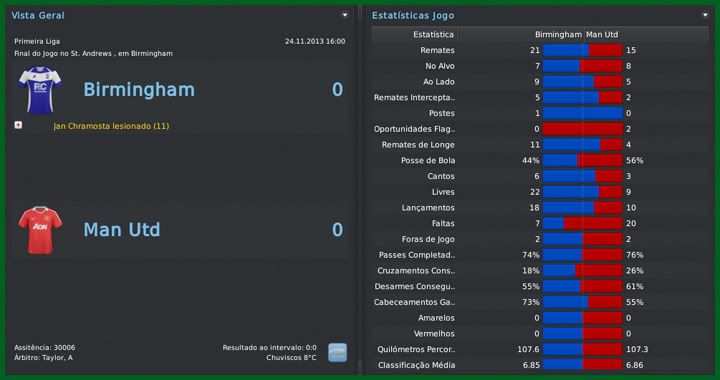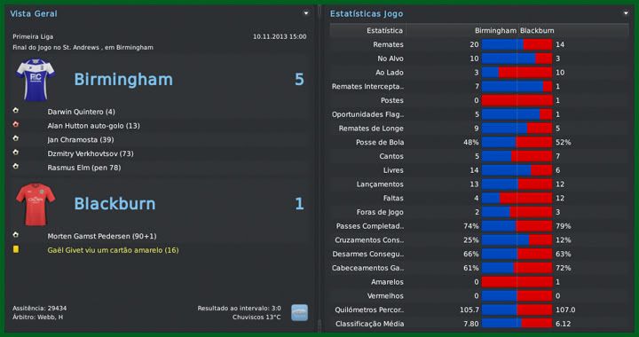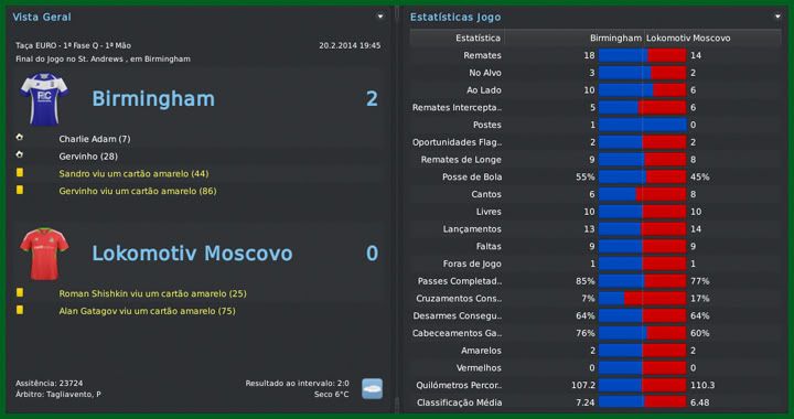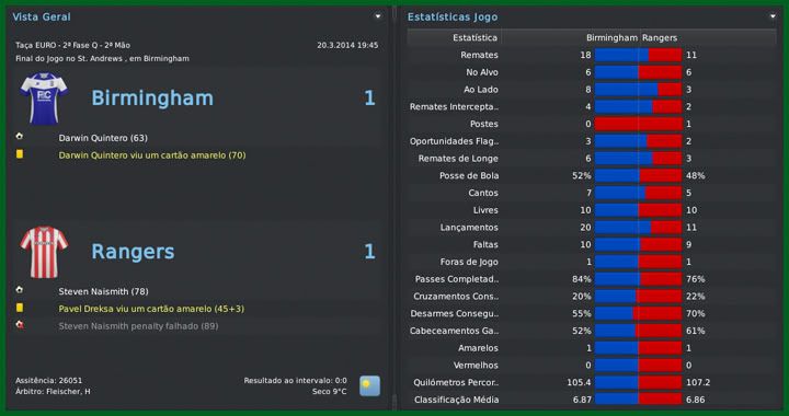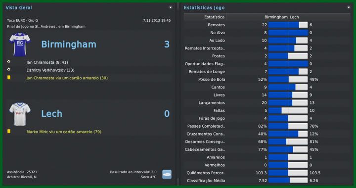 Bruno Trink Postado 13 de Abril 2011 Autor Denunciar Postado 13 de Abril 2011 O início da temporada 2013/14 no Birmingham está melhor do que eu podia crer. Mesmo com muitas caras novas no elenco, uma espinha dorsal foi mantida. Mais especificamente, mantivemos os três zagueiros e os três meias centrais, além do Vela no ataque. Assim, e com um ganho de qualidade nas demais posições, vencemos 13 das primeiras 17 partidas da temporada, muito diferente do início do primeiro ano do Milla no St. Andrews. Até por causa de atuações não tão boas nas duas derrotas, contra City e Tottenham, ainda não dá para apostar em títulos mas, com certeza, o time estará na disputa por eles. Wigan | Manchester City | Olympique de Marseille | Notts County | West Brom | Dinamo Moscou Tottenham | Stoke | Lech Poznan | Everton | Sunderland | Reading | Lech Poznan Muito mais fácil do que eu imaginava, em parte graças ao Olympique de Marseille. Nós fizemos a nossa parte, claro. Empatamos no Velodrome uma partida que jogamos a mais a maior parte do tempo, vencemos o Dinamo no St. Andrews e não tomamos conhecimento do Lech. Mas os russos perderam as duas partidas para os franceses e o grupo já se definiu com duas rodadas de antecipação. Excelente, já que poderei poupar alguns titulares nas duas últimas partidas. Chegamos praticamente no primeiro quarto do campeonato bem onde eu pretendia, entre os primeiros colocados. Perdemos os confrontos diretos, mas ambos fora dos nossos domínios. Pena o empate em casa com o Everton, ainda mais com gol nos acréscimos, mas faz parte. Nenhuma surpresa no fato de que Manchester City e Chelsea, que polarizaram o campeonato na última temporada, também estão no topo da tabela. Nem que o Liverpool, mal há alguns anos, beira a zona do rebaixamento. O United, por sua vez, mantem a base de anos e parece não sentir tanto o primeiro ano sem Sir Alex Ferguson. Com reservas, Belluschi foi o herói da classificação sobre o Notts County. Já com alguns titulares, passamos pelo Sunderland e teremos, mais uma vez, o Liverpool no nosso caminho nas quartas de final. As lesões tem marcado esse nosso início de temporada. Nos primeiros três meses, Collison, Bottinelli, Elm, Lampard, Vela e Quintero, em momentos diferentes, desfalcaram o time por algumas semanas. Além disso, ainda teve a suspensão do Gervinho pela expulsão logo na estreia. Quem aproveitou a brecha foi o Chramosta. Seja antes substituindo o Quintero, seja agora no lugar do Vela, o xodó entrou e fez o que se espera dele: gols. Foi decisivo em algumas partidas e está colocando uma pulga atrás da orelha do Milla. Vela ainda ficará no departamento médico por mais alguns dias e, como Quintero também tem jogado bem, é bem possível que o artilheiro do ano passado fique no banco de reservas. O problema com Charlie Adam parece estar se resolvendo. O escocês ficou melindrado por lhe ter sido tirada a faixa de capitão, mas, por causa das várias contusões no meio de campo, acabei tendo que lançá-lo no time titular. Mesmo ainda com alguns problemas pessoais, ele tem tido boas atuações e está sendo bastante útil com gols e, principalmente, assistências. A situação tática com Gervinho e Afellay também parece contornada, com os dois trocando de posição constantemente e confundindo a marcação adversária. Citar