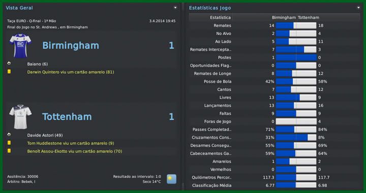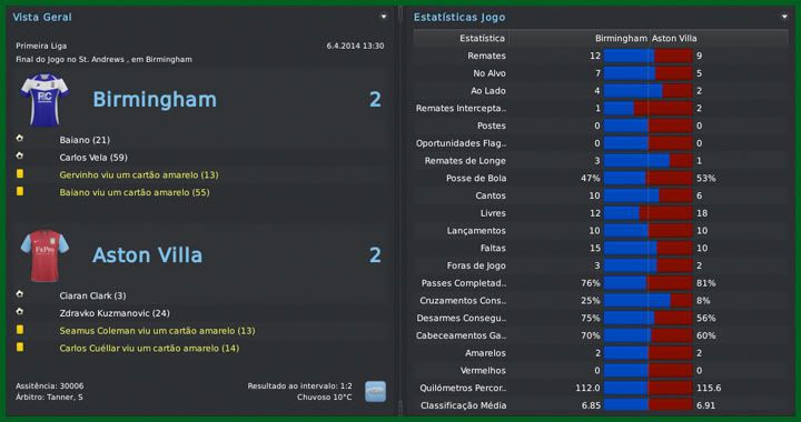 Bruno Trink Postado 20 de Abril 2011 Autor Denunciar Postado 20 de Abril 2011 Uma vitória em cinco partidas é o rendimento esperado para um time que está brigando pelo título da Premier League. Inclusive, agora só estamos nessa briga, já que fomos eliminados pelo Tottenham nas quartas de final da Europa League. A verdade é que não foram resultados absurdos, a não ser o jogo de nove gols contra o Fulham. Empatamos no Old Trafford e no Second City Derby, nada fora do normal, e fizemos partidas equilibradas com os Spurs. Faltam, agora, para nós, cinco decisões e espero que os jogadores entrem nesse clima e encarem cada partida como uma final. Manchester United | Fulham | Tottenham | Aston Villa | Tottenham O Tottenham sempre foi uma equipe que, nesses dois anos, me deu bastante trabalho e sabia que seria muito difícil chegar à semifinal. Para isso, tínhamos que fazer o resultado dentro de casa na primeira partida. Logo aos seis minutos de jogo, Baiano marcou seu primeiro gol pelo Birmingham e parecia que o dia era nosso. Mas os Spurs equilibraram a partida e até passaram a dominá-la. Seguramos bem os 45 primeiros minutos mas Astori empatou logo na volta dos vestiários. Tentei de tudo mas não conseguimos vencer. Em White Hart Lane, precisávamos de gols. Não tínhamos Quintero, suspenso, e ainda perdemos o Lagos, contundido ainda no primeiro tempo. Logo depois, Emanuelson abriu o placar com um chutaço de fora da área. Fomos para cima e, nos acréscimos, empatamos com um gol contra. Modric, de falta, colocou os Spurs na frente novamente mas o mito, Chramosta, quarta opção atualmente para o nosso ataque, empatou em 2 a 2, nos dando, temporariamente, a classificação para a semifinal. A alegria durou sete minutos. Assim como na primeira partida, Davide Astori, zagueiro, marcou o gol decisivo e o Tottenham enfrentará o Leverkusen do artilheiro Kießling, que já tem 18 gols na competição. Uma vitória e dois empates e, mesmo assim, ainda temos chances de conquistar a Premier League. Claro, temos que torcer por tropeços do Chelsea, que não se mostrou muito confiável na reta final da temporada passada, e do Arsenal, com quem ainda temos o confronto direto no Emirates. Além disso, temos que torcer contra o City, que tem duas partidas e seis pontos a menos que nós. Meu objetivo ainda é a vaga na Champions League, mesmo sabendo que o título, apesar de muito difícil, é possível. As partidas que nos restam são: Wolves (fora), Liverpool (casa), Arsenal (fora), Blackpool (casa) e Sunderland (fora). Temos que vencer as cinco, torcer e ver o que acontece. Quintero, com o hat-trick na partida com o Fulham, entrou na briga pela artilharia da Premier League. Baiano, novo titular absoluto, mostrou que sabe também marcar gols. Alguns jogadores, insatisfeitos com a pouca utilização, vieram reclamar. À maioria, simplesmente mostrei quem mandava e eles saíram com o rabinho entre as pernas. Mesmo assim, um bom número deles sairá no final da temporada. Espero conseguir negociar bem pelo menos meia dúzia deles. Citar