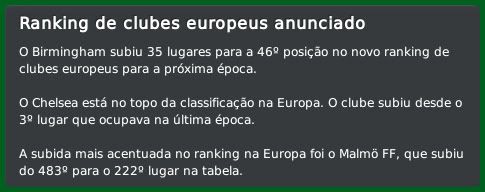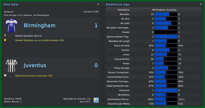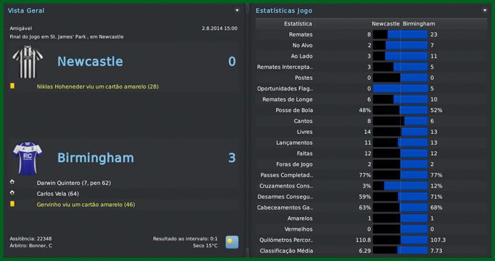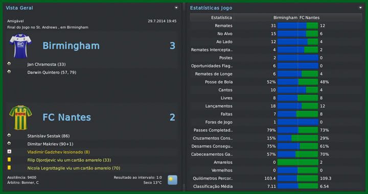 Bruno Trink Postado 25 de Abril 2011 Autor Denunciar Postado 25 de Abril 2011 Com um elenco vice-campeão inglês nas mãos, optei por não contratar muito e arriscar mais uma temporada com o mesmo 3-5-2 que vem funcionando. Por isso, as contratações foram poucas e o objetivo nessa pré-temporada foi equilibrar a folha salarial do clube, tentando evitar, assim, um balanço mensal negativo. Nesse sentido, as saídas mais significativas foram do Foster, do Dann e do Rasmus Elm. Só com os três, a economia foi de mais de €750m mensais. Além deles, Digard e Sutchuin, que passaram a temporada emprestados, foram negociados em definitivo. De todos que saíram, Elm era o único titular na campanha do vice-campeonato. Entre os reforços, dois chegam para disputar com o Charlie Adam as duas vagas de titular no meio de campo. Lee Cattermole, volante do Sunderland, era um sonho antigo e, à princípio, será o titular enquanto Leroy Fer deve começar a temporada no banco. As outras quatro contratações são jovens para compor elenco, mas com perspectiva de futuros brilhantes. O suíço Xherdan Shaqiri, ex-City, estava emprestado ao PSV, joga nas duas alas e até na lateral esquerda. Também do PSV veio o volante Dennis Jonker, com várias convocações para as seleções de base da Holanda e já com uma para a seleção principal. Eric Diarra segue a escola de bons goleiros franceses e tem tudo para ser um dos melhores do mundo nos próximos anos e o argentino Pablo Mazzoni, meia esquerda, vai para o sub-18. Xherdan Shaqiri | Dennis Jonker | Eric Diarra | Lee Cattermole | Leroy Fer | Pablo Mazzoni Mesmo com as várias saídas, o elenco continua bastante equilibrado, com opções para todas as posições do elenco. No mesmo esquema de jogo da temporada passada, com a mudança apenas no lado dos alas, os zagueiros permanecem os mesmos e no ataque tivemos apenas a saída do Bangura, que era a minha última opção. Pensei em contratar um quinto atacante mas, em caso de necessidade, ainda tenho o Gaitán para jogar por ali. O time titular nesse início será praticamente o mesmo que encerrou a temporada, apenas com o Cattermole, com uma função um pouco mais defensiva, no lugar do Elm. Se não tivermos problemas graves de lesões, acredito que esse grupo é suficiente para suportar a temporada inteira, até com os mesmos sessenta jogos que fizemos no ano passado. Em cinco amistoso contra equipes dos mais variados níveis, conseguimos cinco vitórias. Detalhe para a superioridade com que derrotamos o bom time do Nantes e para a vitória sem sustos sobre a Juventus. Plymouth | Nantes | Newcastle | Peterborough | Juventus Iniciamos a Premier League pela primeira vez com status de favoritos. Se não favoritos absolutos, talvez ainda um pouco abaixo de Arsenal, Chelsea e City, pelo menos não será surpresa se passarmos todo o campeonato no topo da tabela, entre os quatro. A estreia é justamente contra o atual campeão, no St. Andrews, e depois saímos para enfrentar Stoke City e Manchester United. A boa campanha na Europa League elevou a posição do Birmingham no ranking europeu de clubes. Mesmo assim, a expectativa da diretoria para essa temporada era apenas de obter novamente a vaga para a segunda competição continental. Minhas ambições são maiores e eu acredito que podemos lutar pelo título, assim como fizemos no ano passado. Fiz essa escolha também para aumentar o orçamento para transferências e salários, o que acabou se mostrando desnecessários com os cortes que fiz no elenco. Outra prova do crescimento do clube foi o número de jogadores do clube convocados para a Copa do Mundo realizada no Brasil. O empréstimo feito pelo presidente Carson Heung, os prêmios recebidos pelo vice-campeonato inglês e os €13M que recebemos a mais do que gastamos nas transferências, tudo isso contribuiu para que o balanço financeiro ficasse positivo nesse início de temporada. Além disso, os prêmios que receberemos pela participação na fase de grupos da Champions League, somados à economia de salários que estamos fazendo, devem equilibrar também o balanço mensal do clube. No final da temporada passada, insatisfeita com o vice-campeonato, a diretoria do Barcelona demitiu Arsène Wenger e Milla foi cotado para o cargo. Mas não passaram de especulações e os blaugranas acertaram com o treinador do Porto, André Villas-Boas. Reais foram as propostas feitas pela Inter e pelo Atletico de Madrid, que perderam seus treinadores, respectivamente Baresi e Quique Flores, para as seleções italiana e espanhola. A proposta interista foi, particularmente, tentadora, mas não saio do Birmingham sem o título inglês. Citar