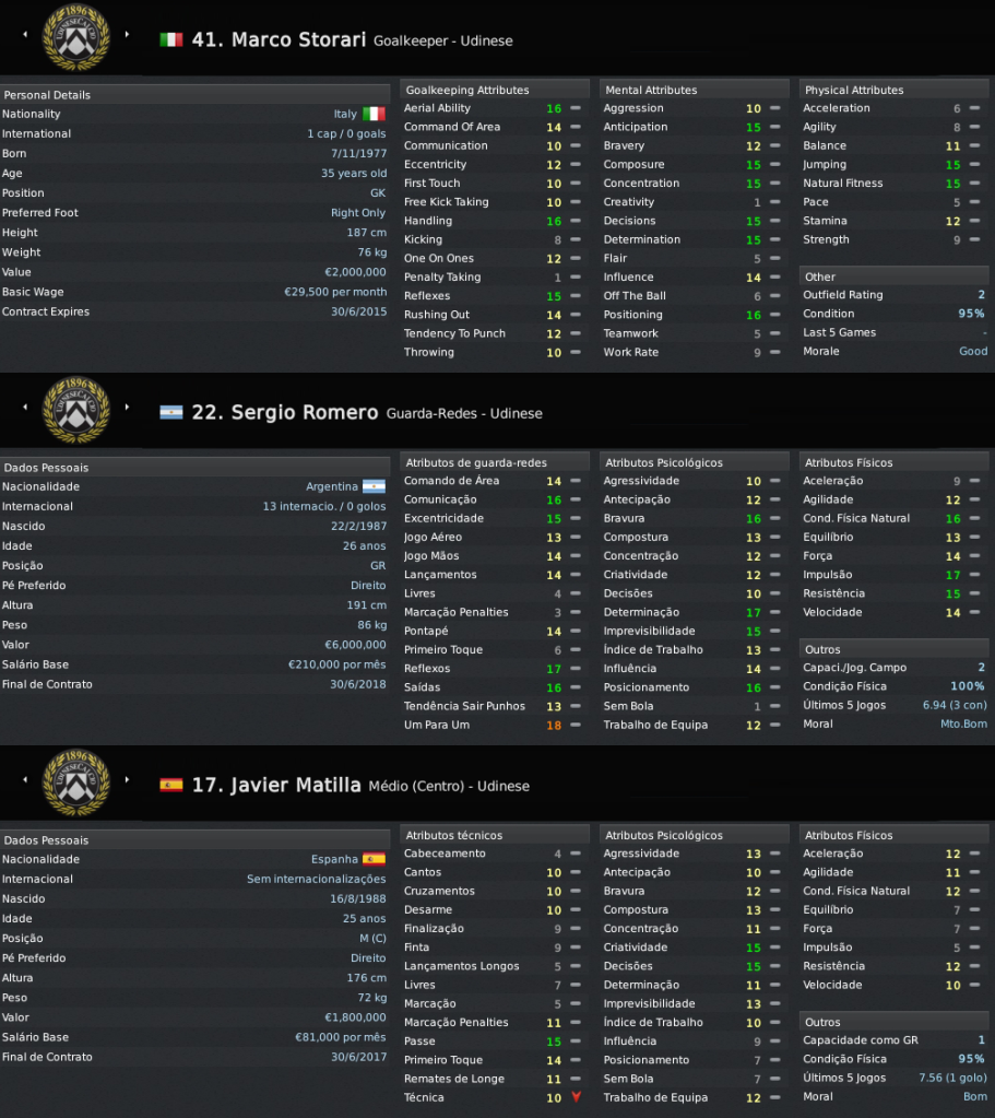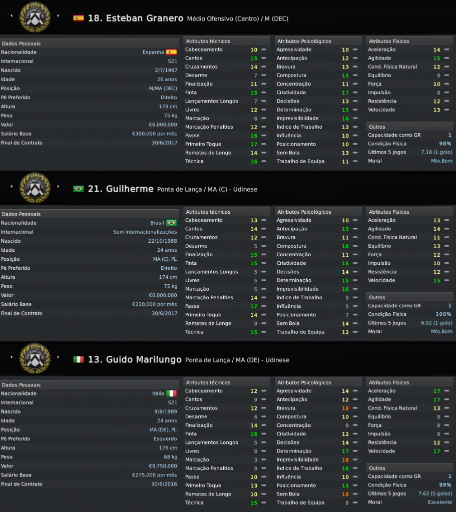 Seo Beraldo Postado 18 de Abril 2011 Autor Denunciar Postado 18 de Abril 2011 Udine, 20 de Agosto de 2013 Após uma pré-temporada com alguns resultados inesperados, e dificuldade para entrosar o time, Gianluca Pagliuca fechou os últimos amistosos com uma grande quantidade de gols marcados, mas insatisfeito com a falta de entrosamento do meio de campo. Pudemos observar que em muitas partidas, Pagliuca alternou entre esquemas com 3 defensores e 2 laterais apoiadores, com 3 zagueiros em linha, dois volantes recuados e 2 alas ofensivos, e também em um esquema com quatro defensores em linha, o já tradicional quarteto dentro do portfólio tático de Pagliuca. O time inesperadamente jogou melhor dentro do Quarteto, e isso pode vir a ser um problema para encaixar os ótimos atacantes que chegaram a Udinese. Apesar de ainda restar alguns dias na janela de transferecias de verão, Pagliuca e a diretoria da Udinese já anunciaram que o banco em Friuli já estava fechado para negociações, e o grupo estava montado. Ninguém entra, ninguém sai até a próxima janela pelo menos. Quem realmente esta a fim de mostrar serviço é o espanhol Esteban Granero, que declarou querer emular a carreira de Di Natale junto a Udinese e ser um dos favoritos da torcida. Se jogar o que jogou na pré-temporada, vai ter um longo caminho, pois faltou-lhe entrosamento, e velocidade em toque de bola. Quem aproveitou os amistosos para mostrar serviço foi Guido Marilungo, que marcou ao todo 8 gols e fez 4 assistencias. De certo o tipo de jogador que quero na Udinese. O destaque negativo foi Paloschi, que apesar de balançar as redes, jogou mal em grande parte das partidas. O Capitão Di Natale também não fez bonito, e atuou bem abaixo do esperado. Porem aos 35 anos, e atributos físicos em queda livre, o atacante aos poucos perdera sua condição de titular. Como fiz muitos amistosos para avaliar diversos aspectos de diversos jogadores, pude também observar o time atuando em diversas táticas. A 352 inicial com laterais, dois MCs e um MAC continua dando resultados, e a estabilidade defensiva é a melhor. Mas perco em qualidade com a bola chegando ao ataque em cruzamentos para meus atacantes baixos (Di Natale, Barocelli e Paloschi). Porem, usando Diabaté tenho grandes oportunidades no jogo aéreo e não descarto esta estratégia. Para melhor usar meus homens rápidos, eu apostaria no quarteto, que usei bastante na temporada passada. E deve ser a formação mais utilizada no decorrer da temporada. Pois a quantidade de jogadores que podem atuar com brilhantismo pelas pontas é grande, nomes como de Pepe, Marilungo, Barocelli, Di Natale e mesmo Granero e Candreva por ali. O que me decepcionei, foi com a formação com alas ao invés de laterais avançados. Estes jogadores ficavam exaustos com as rápidas subidas ao ataque, e voltas fulminantes para defender. Não sei até que ponto que aquentariam fazer isso no decorrer da temporada. Porem tenho boa quantidade de alas, e também não descarto esta opção estratégica. Inicialmente o XI vai ser montado dentro da estrutura do Quarteto Magico, 4231. Formado por: Emiliano Viviano Marco Motta – Andrea Coda – Salvatore Bocchetti – Matteo Rubin Marco Bolatti – Hernan Bernardello Antônio Di Natale – Antônio Candreva – Simone Pepe Alberto Paloschi Marilungo, Barocelli e Jaime seriam os jogadores que entrariam imediatamente nas pontas, enquanto na posição de MAC Guilherme e Granero logo apareceriam para disputar com Candreva a posição. Paloschi reina sozinho no ataque, mas Diabaté deve figurar aos segundo tempos, ou quando quiser mudar a cara de um jogo rápido para um mais cadenciado e de cruzamentos na área. Citar