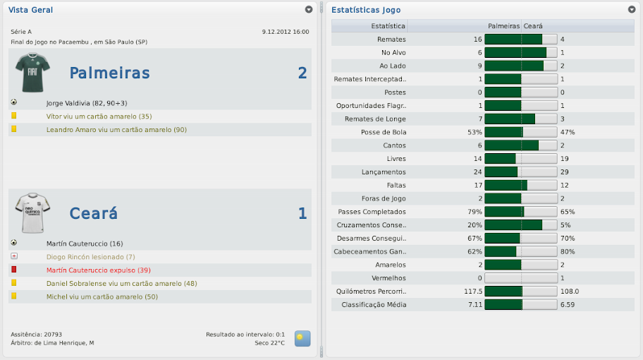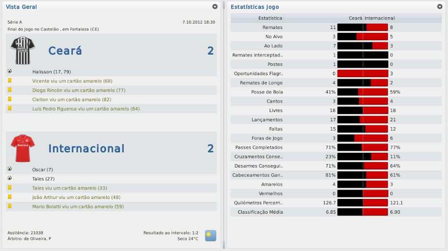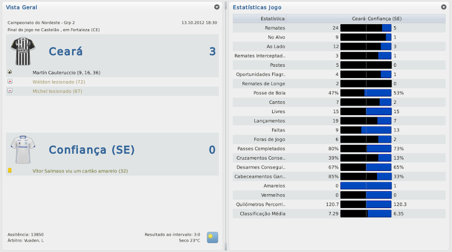 mfeitosa Postado 15 de Maio 2011 Autor Denunciar Postado 15 de Maio 2011 Foi por muito pouco, mas conseguimos seguir à caminho do Penta-Campeonato dentro do planejamento inicial. Jogar contra o Fortaleza tem se tornado cada vez mais difícil. O time já retornou à Série B e logo deve subir também para a elite. No primeiro jogo da final, fomos melhores, mas não garantimos a vitória. Diogo Rincón abriu o marcador aos 27 minutos e Júlio Terceiro empatou ainda no primeiro tempo, já nos acréscimos, 1 a 1. Já pela segunda partida, foi a vez do Fortaleza dominar a partida. Plínio fez o primeiro aos 15 minutos, após cobrança de escanteio de Guto. Empatamos logo aos 26, com Diogo Rincón cobrando pênalti. O veloz Anderson Gomes colocou o Fortaleza novamente à frente aos 58, obrigando ao Vovô a ir para cima com tudo em busca do empate. O gol salvador veio de Daniel Sobralense, aos 73 minutos, 2 a 2. Depois de tanta emoção no tempo regulamentar, a decisão foi para os pênaltis. Fernando Henrique defendeu a última cobrança, de Pedro Oldoni, e garantiu o Bi-Campeonato do Alvinegro! Agora faltam três títulos para o objetivo dentro do estado do Ceará. Quanto aos destaques individuais, Wéldon, como era de se esperar, encerrou como Artilheiro da Competição (objetivo cumprido), com 19 gols, contra 15 do surpreendente Anderson Gomes. O prêmio de Melhor Jogador da liga ficou com o meia Elias, que fez por merecer todos os elogios, pois tem sido fulcral para o nosso esquema tático. Outros que foram lembrados nesta lista foram o zagueiro Fabrício e o meia Diogo Rincón. Já pelas Oitavas-de-Final da Libertadores da América, fizemos bem o nosso papel na primeira partida contra o Newell's Old Boys, contando com a ajuda de Fabricio Fuentes, que nos fez o favor de ser expulso logo no primeiro minuto de jogo. De uma forma ou de outra, precisamos dos 90 minutos completos para garantir aquela vitória. Foi dos pés de Martín Cauteruccio que saiu o gol que encheu de esperança todos no Vovô, 1 a 0. Esperança que se esvaiu logo na primeira etapa da segunda partida, já em Rosário. Gonzalo Rovira passou por dois e abriu o placar. Para piorar a situação, Cleiton foi expulso aos 73 minutos e, no lance seguinte, Daniel Sobralense fez gol contra. Àquela altura, com um time exausto em campo, nada mais eu poderia fazer a não ser esperar que algum milagre acontecesse. Não aconteceu e os argentinos do Newell's Old Boys passaram adiante na competição, 2 a 0. Entretanto, fiquei satisfeito pela campanha, como um todo. Era a nossa participação na maior competição continental das Américas e fizemos bem o nosso papel. O título da Libertadores ficou novamente com o Estudiantes, da Argentina, mais uma vez sobre um clube brasileiro, o Palmeiras. A Bota de Ouro foi para Gastón Fernández, do mesmo Estudiantes de La Plata, com 15 gols marcados, e o prêmio de Melhor Jogador para Jorge Valdívia, do Palmeiras. No Dream Team, os argentinos do Estudiantes foram a grande maioria, com oito dos onze jogadores escolhidos. FASE FINAL | DESTAQUES INDIVIDUAIS Ok! A algo de errado aqui ou finalmente conseguimos render o que queríamos? Estamos a fazer uma campanha fantástica na Série A de 2012, superando todas as expectativas, principalmente, as minhas. Estreamos com três goleadas sobre Botafogo, Vasco da Gama e Ponte Preta e, logo em seguida, finalmente conseguimos quebrar o tabu e vencemos o Corinthians pela primeira vez, até então. Tivemos uma leve caída de produção com o empate frente ao Cruzeiro, vitória apertada contra o Flamengo e derrota para Internacional. Mas a carroça está sem 'frei" mesmo! Encaixamos uma magnífica sequência de nada menos que oito vitórias consecutivas, que nos deixaram isoladíssimos na liderança do Brasileirão. Sobrou para todo mundo: Grêmio Prudente, Santos, São Paulo, Figueirense, Avaí, Vitória, Fluminense e até o Atlético Mineiro, então campeão da Série A. Todavia, voltamos a cair de produção com a derrota para o Grêmio, vitória sobre o Coritiba e dois empates, Portuguesa e Palmeiras. Com esta bela campanha até aqui, estamos na liderança da competição com 45 pontos, 8 a mais que o vice Santos. Resta saber se conseguiremos manter o alto nível e, enfim, entrar para a história do clube com um título de tanta importância no quadro nacional. A tendência é que caiamos de produção neste Segundo Turno, pois o peso de um elenco forte começa a se fazer presente exatamente nesta faixa da competição. Mesmo sabendo disso, terminar a Série A sem ao menos uma quarta colocação será um duro golpe. CLASSIFICAÇÃO | CALENDÁRIO Citar