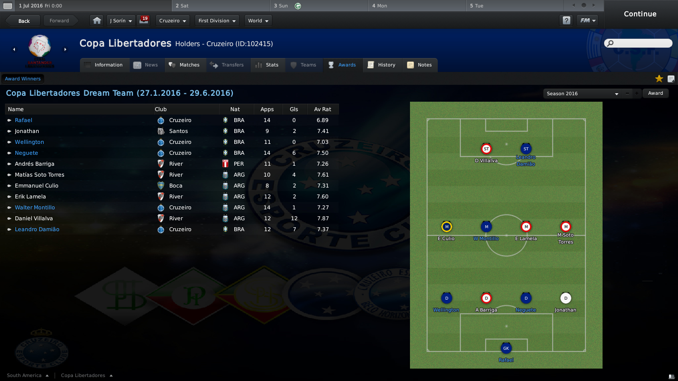 Vice-Presidente Henrique M. Postado 11 de Julho 2011 Vice-Presidente Denunciar Postado 11 de Julho 2011 ai é diferente rss Eu não tinha dito? Iniciamos a campanha pelo hexa no Grupo C da Libertadores, junto com Boca Juniors, Peñarol e Colo Colo. Se formos considerar a história de cada clube na competição, seria um grupo dificílimo, mas o FM fez o favor de criar um abismo inimaginável entre essas equipes, acabou que a disputa da vaga ficou polarizada entre eu e o Boca, e o que acabou sendo decisivo foi meu empate perante o Colo Colo, para que terminassemos em segundo. v Boca (no Mineirão) | v Colo Colo | v Boca (na La Bombonera) Nas oitavas de final enfrentamos o Emelec, parecia que seria um confronto fácil, mas conseguimos nos complicar jogando em casa e perdemos a primeira partida dessa disputa. Mas no jogo de volta, a gana e ofensividade do escrete celeste fizeram a diferença e revertermos a desvantagem e passamos para as quartas de final, aonde enfrentaríamos o Coritiba, que havia se consagrado campeão da Copa do Brasil do ano anterior. Contra o Coxa, a primeira partida foi fora de casa, poderíamos ter conseguido um resultado amplamente positivo se Montillo não tivesse desperdiçado a cobrança de pênalti, portanto, a decisão ficou para Belo Horizonte. A partida de volta foi truncada, mas decidida por um pombo sem asa de Henrique logo no começo do jogo, com esse chute Henrique colocou a equipe diante do Internacional de Porto Alegre na disputa da vaga na final. O primeiro jogo da final, foi uma grande demonstração da equipe, a equipe gaúcha foi completamente anulada dentro de campo, não conseguiram sequer chutar uma bola ao gol, um leve detalhe, jogamos boa parte do jogo com um jogador a menos, já que Tinga foi expulso nos 10 minutos finais do primeiro tempo e gol mesmo foi só um, mas o suficiente para levar o time celeste para a final, já que em Porto Alegre, nenhuma das equipes conseguiu marcar gols, o que era bom para a gente e assim, iríamos pegar o River Plate que havia destroçado o seu maior rival, o Boca, na outra semi-final. A final marcava uma revanche que datava de 40 anos, pois na Libertadores de 1976, os dois clubes haviam decidido a mesma competição, com vitória azul no final das contas, outra curiosidade é que essa é minha segunda final de Libertadores e me vejo diante mais uma vez de um clube pelo qual tenho apreço, vale lembrar que na outra oportunidade fui derrotado. Voltando a final, era um encontro de dois estilos totalmente diferentes aplicados nessa Libertadores, o meu Cruzeiro, que era extremamente burocrático, fazia o que era necessário para ser campeão e um River Plate infernal, que destruia tudo que passava pela sua frente. Mas todos sabemos que no final das contas o que vale é dentro de campo e lá, a história é diferente. Mais uma vez anulamos o adversário e impomos nosso estilo de jogo, mas o gol não saia de maneira alguma. Até que no começo do segundo tempo, a estrela de Damião brilhou e em uma brilhante jogada individual, o atacante invadiu a área adversária, fintou um zagueiro e mandou a bola para o fundo das redes, aí, o que já estava visível, se acentuou mais, o gol levou nossa equipe mais a frente, enquanto o River ficava amendrotado no seu campo, mais uma vez Damião brilhou e em uma excelente assistência, deu o gol para Wallyson dar números finais ao placar. Iriamos para Buenos Aires com uma vantagem excepcional. Iria para o jogo mais importante da minha carreira até o momento, a chance de me sagrar campeão continental logo na minha primeira Libertadores com o Cruzeiro. Mas do outro lado tinha um rival que merecia cuidado e atenção e o jogo decisivo, fez jus ao que as duas equipes representam no futebol sul-americano. Os Millonarios partiram para cima e aos 20 minutos abriram o marcador, mas isso não fez a equipe deles crescer mais do que devia, pois meus jogadores começaram a tomar conta do jogo e tranquilizá-lo, mas eu não queria dar sopa para o azar e no segundo tempo mandei os jogadores irem a carga e e matarem a pau. Leandro Damião, o herói desse título, já que destruiu nos 4 jogos mais importantes, fez mais um gol na final no meio do segundo tempo e já jogou aquela ducha de água fria nos argentinos, que com isso, foram obrigados a irem a frente e num contra-ataque, o nosso argentino bateu os pregos no caixão, Montillo fez dois a um e íamos com tudo para a comemoração do título, Villalva ainda tentou esboçar uma reação, mas não foi o suficiente para nada, já tinhamos derrubado o adversário a muito tempo. Ao soar do apito de Oscar Candia, o Cruzeiro se sagrava HEXA CAMPEÂO continental e eu conquistava a tão sonhada taça. v Emelec (casa) | v Emelec (fora) | v Coritiba (fora) | v Coritiba (casa) | v Internacional (casa) | v Internacional (fora) | v River (casa) | v River (fora) Clique para conferir as estatísticas individuais e gerais e o chaveamento Não vou dizer que o título ficou com o melhor futebol da competição, pois é notório que o River Plate, em sua campanha jogou um futebol muito mais bonito e envolvente, mas eu não busquei, em momento algum, jogar um futebol bonito, eu queria era eficiência e isso nós cansamos de mostrar durante os momentos mais importantes da competição. Vale lembrar que tivemos também jogadores iluminados, Neguete que durante a fase de grupos foi praticamente um monstro, Montillo com sua tradicional classe conduzindo a meiuca azul e sem falar nele, Leandro Damião, que quando o bicho pegou, chamou a responsabilidade e ajudou o Cruzeiro a atropelar os adversários. Neguete inclusive ficou em 3º lugar como o melhor jogador da Libertadores e estava no Dream Team da competição. Vale lembrar que esse título me ajudou bastante, pois meu pescoço já estava na corda por causa do Mineiro e com isso agradei a diretoria, torcida e os ícones do clube. Agora é rumo ao tri brasileiro e ao bi mundial,