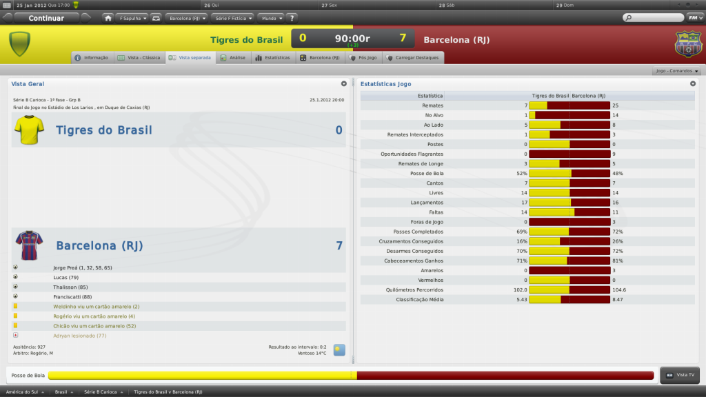 Jirimias Postado 15 de Junho 2011 Autor Denunciar Postado 15 de Junho 2011 "Barcelomania." Se depender de torcida a favor, o Barcelona vai longe.O clube que já contava com o apoio de quase 60 mil torcedores, membros do Fórum Manager, agora também conquistou um lugar no coração de torcedores dos grandes times do Rio.Torcedores que antigamente não iam aos estádios para ver os jogos do Barcelona agora travam verdadeiras lutar para conseguirem um dos dois mil ingressos possíveis para as partidas em casa. É bem verdade que o Barcelona nunca teve um torcedor somente seu, o clube sempre foi segunda opção até mesmo entre seus torcedores mais fiéis, e isso só mudará se um dia o time conseguir um sucesso imaginável, quase tão grandioso como o nome que carrega, mas é inegável que o Barça Carioca tem ganhado cada vez mais espaço no coração dos torcedores. A "Barcelomania" que faz muitos torcedores comprarem a camisa oficial do clube e comprar dos ingressos é reflexo da magia que cerca a invencibilidade do clube, que alcançou 15 meses sem derrotas ou empates em jogos oficiais.Um resultado claro da paixão causada pelo Barcelona está nas estatísticas de público, apesar de ter a oitava média de público da RJ2, é até o momento o clube que mais vezes esgotou a venda dos ingressos ( oito vezes ). As camisas do Barcelona/RJ nunca fizeram tanto sucesso. A razão da "Barcelomania". Imparável, invicto, intocável, enfim todo tipo de adjetivo não é nenhum exagero para a "Melhor Equipe do Mundo", termo este guardado as devidas proporções.Vem do campo, dos recordes batidos a cada partida, a mania que faz comprar camisas e auxilia na venda dos ingressos.Mas o Barcelona sabe do risco que corre para não se tornar somente um fogo de palha, mania de torcida jovem e etc, por isso é necessário profissionalismo fora das quatro linhas. A realidade do Barcelona. Vai chegar o dia em que a diretoria do Barça descobrirá que precisará de um estádio, mas até lá o clube precisará colocar suas finanças em dia.Para se ter uma idéia de que a solução não é simples, cito um exemplo de perda de dinheiro: o Barcelona terá ainda dois anos para cumprir de contrato com o atual patrocinador, o Brechó Brasil, de Realengo, que ajuda o clube com míseros R$12 mil em patrocínio anual, mas que por força de contrato o clube foi impedido de fechar um contrato maior.Várias propostas já surgiram, e tiveram que ser prontamente recusadas. Resultados do Barcelona em 2012. O Cariocão como solução. Classificado para a segunda fase da RJ2, o Barcelona agora se prepara para transformar os próximos vinte e dois jogos em seus últimos jogos fora da elite do campeonato estadual.Se conseguir a promoção inédita, o Barcelona dará passos largos para melhorar sua finanças, sem contar que o clube correrá o "sério risco" de classificar para a Copa do Brasil, uma visibilidade que está longe de ocorrer se o clube depender apenas das participações nas Séries F, E, ou D. Mas até aproveitar melhor o que o Cariocão ou Copa do Brasil pode oferecer, o Barcelona dependeria de um estádio novo, pois o clube sempre vai bater na capacidade máxima do ovo que é o Estádio Honório Rangel,vulgo Estádio Barcelona.Fica aí minha pergunta: quem vem primeiro o Estádio ou as finanças?Cabe a diretoria decidir qual é a melhor resposta. Classificação Grupo A. Classificação Grupo B. Números do Barcelona em 2012. OBS:Improvisei dois kits para o Barça.Não reparem pois nunca fiz antes, foi somente para quebrar um galho. Citar