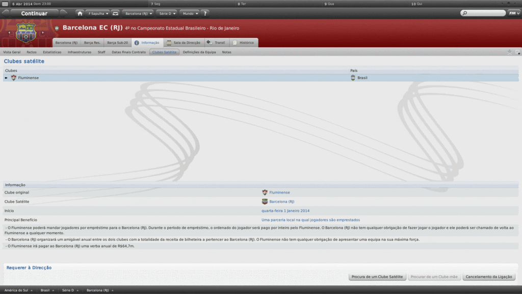 Jirimias Postado 25 de Junho 2011 Autor Denunciar Postado 25 de Junho 2011 RICARDO TEIXEIRA ANUNCIA A EXTINÇÃO DA COPA DO BRASIL. Sim, ele está rindo de nós!! COPA DO BRASIL:Os boatos acerca da extinção da Copa do Brasil acabaram se confirmando.Apesar da competição não ter sido disputada nos últimos três anos, ainda havia a esperança de que a segunda competição do país retornasse nesta temporada, mas a entrevista de Ricardo Teixeira, nesta manhã, decretou o fim da competição. Sob a alegação de que a Copa do Brasil já não era rentável para os grandes clubes, e que a criação das Séries E,F e G alcançou os clubes menores, Ricardo Teixeira afirmou que a Copa do Brasil já não era mais necessária. " - A Copa do Brasil sempre teve este charme de trazer para disputa os pequenos clubes de todo o Brasil, mas hoje com as três divisões criadas, não há muito razão para mantermos uma competição que não é rentável para os grandes e que com raras exceção proporcionava algum sucesso para os pequenos." - disse Ricardo Teixeira. Com a confirmação do fim da Copa do Brasil, a distribuição das vagas para a Libertadores continuará como está, os cinco melhores colocados da Série A qualificam-se para a competição continental. Repercussão no Barcinha A notícia da extinção da Copa do Brasil caiu como uma bomba no Barcelona.Para Félix Sapulha, a decisão da CBF é leviana e somente comprova que os interesses dos clubes maiores tem ficado sempre acima de qualquer outra coisa.Para o Barcelona o fim da Copa do Brasil também representa prejuízos: além de ter investido em aumentar o estádio para atender as exigências da CBF, o clube também esperava contar com as receitas com prêmios e bilheterias da competição. Sobre isso, o presidente Valdeir disse: "Quando decidimos investir na expansão de nosso estádio não foi uma questão de vaidade, foram eles que exigiram, agora simplesmente extinguem a competição?!Não vamos deixar por isso mesmo, queremos ressarcimento pelas perdas! " Esclarecimentos: Tenho deixado passar algumas coisas neste save, mas esta aí não teve jeito.Infelizmente, o save apresenta inúmeros bugs devido ao uso do update, e tenho administrado os erros para evitar o fim do save, e esta notícia acima é um exemplo disso: Quando o Leandro perguntou sobre a Copa do Brasil, aí eu estranhei o fato de não ter visto nenhum sorteio,fui conferir e para minha surpresa a competição não foi mais disputada desde 2010;As divisões inferiores estaduais também apresentaram bugs: apesar da reputação dentro do jogo não ser alta, estas competições tem feito a reputação dos clubes crescerem.O Barcelona, por exemplo, depois da Copa Rio, ficou com reputação Mundial, tive que apelar para o editor para retornar a reputação nacional e não perder o save, pois a reputação iria estragar os planos de subida gradual com o time.Por isso é que o Muricy assinou com o América/RJ e agora está treinando o América/SP.Isso no final das contas nem me incomodou muito, pois os clubes com esta reputação poderiam tornar o save bem mais difícil,pois poderiam contratar melhor.Os maiores clubes do Brasil são matsubara,Araxá,Portuguesa Santista,Francisco Beltrão e etc.Veja a tela do matsubaraA reputação do Sapulha tb foi para continental e tb tive que recorrer ao editor para voltar para profissional. Pensei até em terminar o save, recomeçar ele da Série C, mas estou gostando muito de jogar com o Barça e tenho alguns projetos para as próximas temporadas,e não vai ser estes erros de editor, por mais absurdos que sejam, que vão me atrapalhar.Conto com a compreensão e o apoio de sempre de todos vocês. Citar