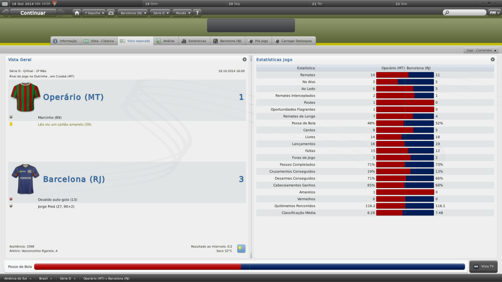 Jirimias Postado 26 de Junho 2011 Autor Denunciar Postado 26 de Junho 2011 o ypiranga nao tinha 100%, empatou um jogo na primeira fase :P estamos na série C, parabéns jiri, pena não termos sido campeões gostei do rumo que a história tomou para o save reiniciar, foi bem inteligente jiri :) vamo que vamo barcinha na série C Ah, é rsrs, valeu! O título escapou, jogar contra times de reputação mundial é osso hehe. Valeu,Zimmer!Tive que quebrar a cabeça pois o save tomou um rumo que eu não esperava. Vamos lá! Citar
