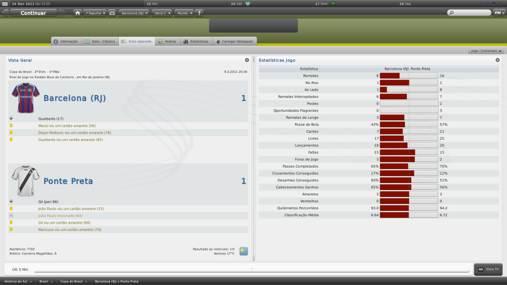 Jirimias Postado 2 de Julho 2011 Autor Denunciar Postado 2 de Julho 2011 Caramba, que pena que não deu pra beliscar uma vaguinha na fase seguinte. Estranhei esses números do time, 8 gols marcados e 6 sofridos em 7 jogos. São números perigosos, tem que tomar cuidado com isso. Se reforçou bem, o Fidel vai dar um gás novo ao elenco e o Andrade é muito bom. Sobre o time, tenta apostar mais no Gualberto, é um ótimo zagueiro. ps: que horas vai ter a divulgação dos kits?? Não deu, o time tava ainda em fase de entrosamento e alguns vacilos custaram a vaga.Vc está certo quanto aos números, espero conseguir dar um jeito neles, pois o ataque fez poucos gols e a defesa sofreu gols em quase todos os jogos. São dois grandes reforços, o Fidel já conheço de outros verões e é um jogador que valoriza bastante e´é muitas vezes decisivo. Não joguei com o Andrade, mas os atributos dele me animam bastante.Gualberto é titular, ele e o Thiago Gomes. Sobre os kits, ainda estou esperando se haverá mais contribuições,por enquanto temos quatro participantes, mas devo postar amanhã, conforme previsto, pois hj à noite vou sair. montou um time forte, que com mais entrosamento pode engrossar ainda mais pros grandes preá mito! Preá tem um passado recente como sombra rsrs, mas mitou mesmo nas quatro temporadas anteriores. O time vai chegar forte na Série C. po.. formou um time forte mesmo reiniciando o jogo.. muito bom vamo que vamo barcinha! Sim, e tive que contratar muito para grantir uma base para a próxima temporada também, e quem sabe conseguir levantar uma grana com algumas vendas. Vamo que vamo!! Citar