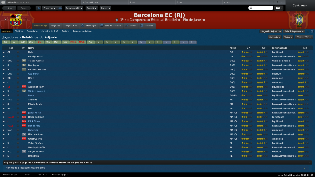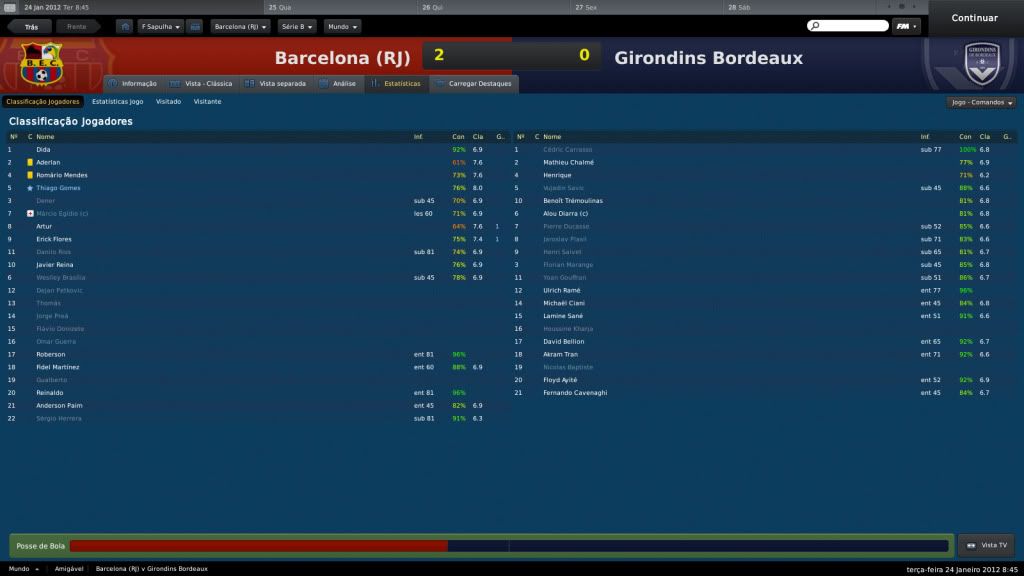 Jirimias Postado 9 de Julho 2011 Autor Denunciar Postado 9 de Julho 2011 Jiri, perdi um pouco o fio da meada do seu save, mas agora estou em dia. Aquela final com o Criciúma foi um chocolate de dar inveja a qualquer clube. Blza,gg!A final foi mesmo um chocolate, não demos chance para o pobre Marília. :trolldevil: Um grande feito foi a parceria com o Barça da Espanha. Com essa entrada a mais de dinheiro deve conseguir uma aumentada boa no nível do time. A parceria tem ajudado muito o clube, falta só um jogo com eles. Como o time teve prejuízos de novo, o valor para salários não aumentou muito, o que tá atrapanhando um pouco nas contratações, o jeito vai ser mexer na verba de transferências. Que parceria sensacional! Que promoção ótima! Agora as coisas apertam, tá na hora de recrutar mais uns argentinos ai para subir pra Série A. Tá dando tudo certinho, é bom ter um clube parceiro como o Barça. Não temos tido oportunidade de contratar argentinos, por enquanto vamos de colombianos e uruguaios rs Citar