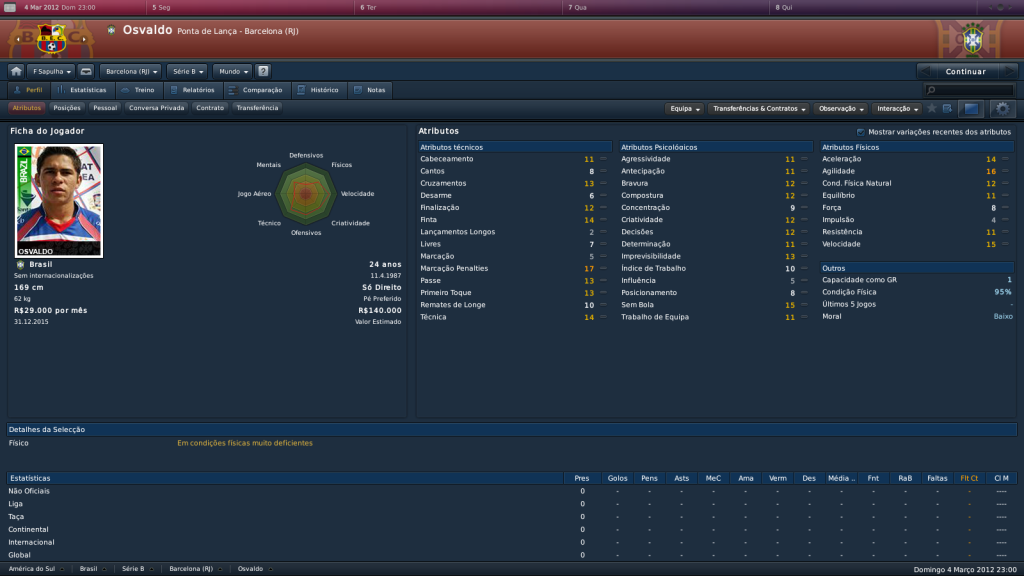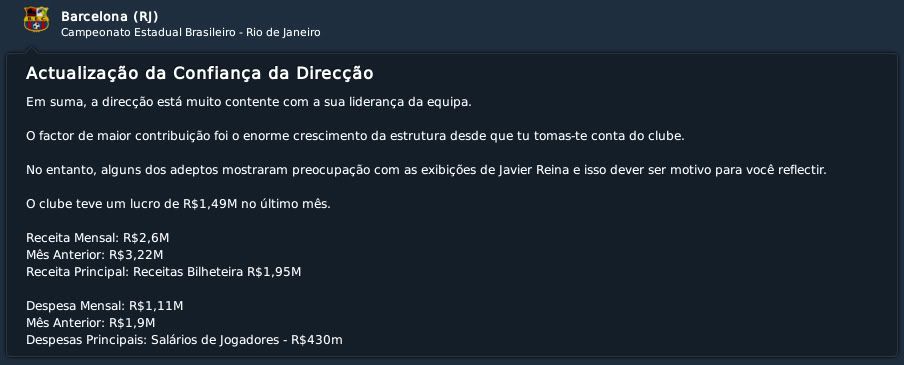 Jirimias Postado 10 de Julho 2011 Autor Denunciar Postado 10 de Julho 2011 parabéns pelo título da Taça Guanabara, agora é ir com tudo pra cima da Taça Rio. Pra cima deles, Barcinha !!! Vlw!A taça rio tende sempre a ser mais fácil pelo número de clássicos que os grandes disputam, mas tem que ter sorte para os grandes que tropecem ser do nosso grupo, então o melhor é jogar como no primeiro turno. É CAMPEÃO !!! É CAMPEÃO Ih, pega não, é o bonde do Tratorzão !!! Porra, chorei DEMAIS na final. Que coisa linda, a torcida não parava de gritar, momento inesquecível na minha vida. Agora é ganhar a Taça Rio, temos condições pra isso !!! IIh, beleza, passamos do Fortaleza !!! Não parei de gritar isso no dia do jogo, também não foi pra menos, o time atropelou no primeiro tempo, dá até pra entender a moleza no segundo. É Campeão!!!Depois de três temporadas tinha que chegar a nossa hora.A nossa torcida fez bonito, lógico ainda não é tão grande como as torcidas do grande, mas incomoda.Vamos no memso ritmo para a Taça Rio. O barcinha deu um susto na torcida hehe, mas no fim deu tudo certo. A ordem dos jogos era assim mesmo, ou era pra ter sido cronológica? Se era assim mesmo, não fez muito sentido :heh: Mas o que importa é que o Barcinha é campeão!!! Passou pelo Flamengo num grande jogo do Colombiano, e na final, diante do Vasco, sem Juninho Pernambucano = Vice, chora Vita... :bleh: É cronológica, debaixo para cima,como ocorre nos blogs, sites e etc. Esse colombiano é bom de bola mesmo, matador nato, no jogo contra o Vasco jogou o árbitro que é melhor que o Reizinho rsrs.Mas deu o de sempre, se bem que vice do Barcelona é difícil de engolir. Gostei das contratações, principalmente do Bismarck, já treinei ele no leão e ele desenvolve muito. Opa, grande conquista, mais um gigante carioca caiu! haha Eu também estava presente lá no estádio na final, saí de lá rouco, mas valeu a pena. Ah, passou pelo meu Leão. ): Fiquei triste agora kkk Eu tinha duas opções para esta posição, e meu adjunto mostrou o Bismarck com quase 4 estrelas, então acatei logo, e já tem sido importante em alguns jogos. Certamente valeu a pena, foi o primeiro título estadual,ainda que seja um turno, agora é tentar vencer tb o segundo turno, mas o importante é que decidiremos o título. kkk é assim mesmo o Barcinha divide corações rsrs, mas o Leão fez jus ao nome, lutou muito. Porra,passou pelo Leão,mas ainda deu uma luta o Fortaleza,pelo que posso ver..porém nada para o Barcinha agora! E contratou Osvaldo e Bismarck,dois excelentes jogadores,revelados pelo Fortaleza,tanto no FM(pela minha mínima experiência) e na real ( o último nem tanto assim.),serão grandes adições ao Barça! E parabéns pela taça Guanabara,merecidissímo, esse título devia ter vindo a um ano atrás,pelo menos :D! Voltamos do Ceará com dois jogadores revelados lá, aproveitamos bem a estadia lá no primeiro jogo.O Fortaleza deu trabalho no segundo tempo,mas que bom que parou nos três gols. Vc valou bem, como perseguimos este título e ele não veio, merecíamos mesmo. Foi um excelente título na Guanabara e acho que reforçou bastante bem o time com os ex-Fortaleza. Fez um jogo e tanto contra o Vasco, hein?! kkk o jogo contra o Vasco foi o pior que já joguei, mas ao mesmo tempo segurá-los com dois a menos exigiu muito empenho dos jogadores. Um título de valor por todos os contratempos.Ótimos reforços mesmo, aos poucos estamos formando o time para a Série B. Citar
