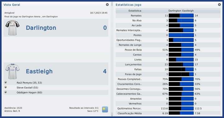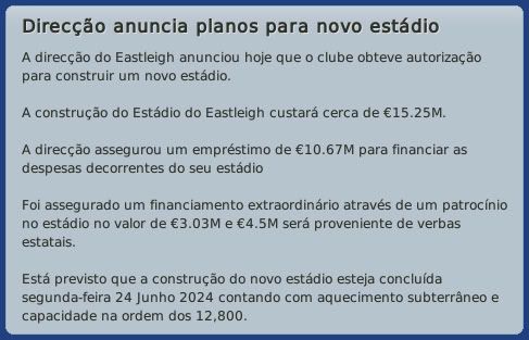 Bruno Trink Postado 11 de Agosto 2011 Denunciar Postado 11 de Agosto 2011 Eastleigh, 12 de agosto de 2023 Como se não bastasse a felicidade pela inesperada conquista do acesso para a Championship, ainda tive três excelentes notícias antes do elenco entrar em férias. Além da minha escolha como treinador do ano da League 1, a diretoria ainda me informou sobre o andamento das obras da academia para as divisões de base, que deve ficar pronta no final desse mês, e sobre a autorização que conseguiram para a construção de um novo estádio. Tivemos lotações esgotadas em praticamente todas as partidas da temporada e o acanhado Silverlake Stadium já estava pequeno com seus 2300 lugares. Com aquecimento subterrâneo e capacidade para 12800 espectadores, nossa nova casa deve ficar pronta em um ano e essa será, então, a temporada de despedida do Silverlake. Para que não seja uma temporada de sufoco, nós da comissão técnica trabalhamos muito nas férias dos jogadores. Primeiro para definir quem deixaria o elenco. Basicamente, saíram os emprestados e aqueles cujos contratos estavam terminando. Entre esses, a torcida não aceitou muito bem que eu tivesse deixado o Simon Douglas sair. Artilheiro do time nas conquistas da Blue Square Premier e da League 2, Douglas já não teve quase chances no último ano e os torcedores não conseguiram perceber que o clube estava evoluindo, mas nosso antigo ídolo não. Uma pena, também gostava muito do Simon, mas não havia mais espaço para ele no grupo. Se, além dos vários sub-18, dez jogadores deixaram o Eastleigh, outros dez se incorporaram ao elenco principal. A base do time titular que terminou a temporada será mantida. Toda a linha defensiva e mais os dois volantes continuam no onze mas, do meio pra frente, apenas Eastall fica. Nosso novo ataque será formado pelo ítalo-argentino Raúl Pereyra, emprestado pelo Arsenal, e o norueguês Oddbjørn Hagen. O meia esquerda brasileiro Mauro, que chega por empréstimo do Manchester City, é o outro novo titular. Os demais, incluindo aí o trio francês formado por Thouvenin, Sekou Yao e Serres. Uma das novidades não é tão nova assim. Trata-se do lateral espanhol Óscar Baena, que chegou ao clube há duas temporadas e estava se destacando muito no nosso sub-18. Tanto que já provocava o interesse de clubes como Reading, Cesena, Genoa, Osasuna e Racing antes mesmo de subir para o elenco principal. Raúl Pereyra MA C,PL | Sébastien Thouvenin GR | Sekou Yao D C | Nouredine Serres D D | Richard Johnson PL Mauro M/MA E | Oddbjørn Hagen PL | Thomas Müller D C,MD,M C | Thomas Erkenbrecher M/MA D | Óscar Baena D/DA DE Fizemos cinco amistosos nessa pré-temporada e eu dei preferência para marcá-los contra adversários mais fortes. Isso porque, em teoria, na Championship encontraremos times de um nível acima do nosso e, contra o Blackburn e o West Ham pudemos fazer esse tipo de teste. Perdemos as duas, é verdade, mas fizemos um bom primeiro tempo contra os rovers e a goleada só se deu no final da partida, com nosso time já desfigurado. Já contra o Crystal Palace, recém rebaixado da Premier League, conseguimos fazer um jogo bem equilibrado nos 90 minutos. Wycombe Wanderers | Darlington | Blackburn Rovers | West Ham United | Crystal Palace Os novos contratados, principalmente o Pereyra e o Hagen, me proporcionaram a possibilidade de voltar a usar dois atacantes, o que não consegui fazer na temporada passada. Assim, volto para um 4-4-2, com a diferença de que mantivemos os dois volantes na proteção à zaga, o que pode liberar as saídas rápidas de contra-ataque pelos flancos. Fica claro que este é um elenco que lutará apenas pela permanência na Championship, sem pretensões maiores. A chegada à segunda divisão nos proporcionou um ligeiro salto financeiro, muito pelo aumento das cotas de televisão. Mesmo com uma situação financeira estável, não pude fazer loucuras, até pensando que nossas bilheterias ainda não são boas e que temos que pagar o empréstimo que o clube tomou para a construção do novo estádio. Hoje temos a menor folha salarial entre os 24 clubes da Championship, 16 vezes menor que a do Hull City. A verdade é que ainda somos um clube regional, recém chegado ao profissionalismo, lutando para aparecer no extremamente competitivo futebol inglês. Veremos o que podemos fazer nessa temporada.